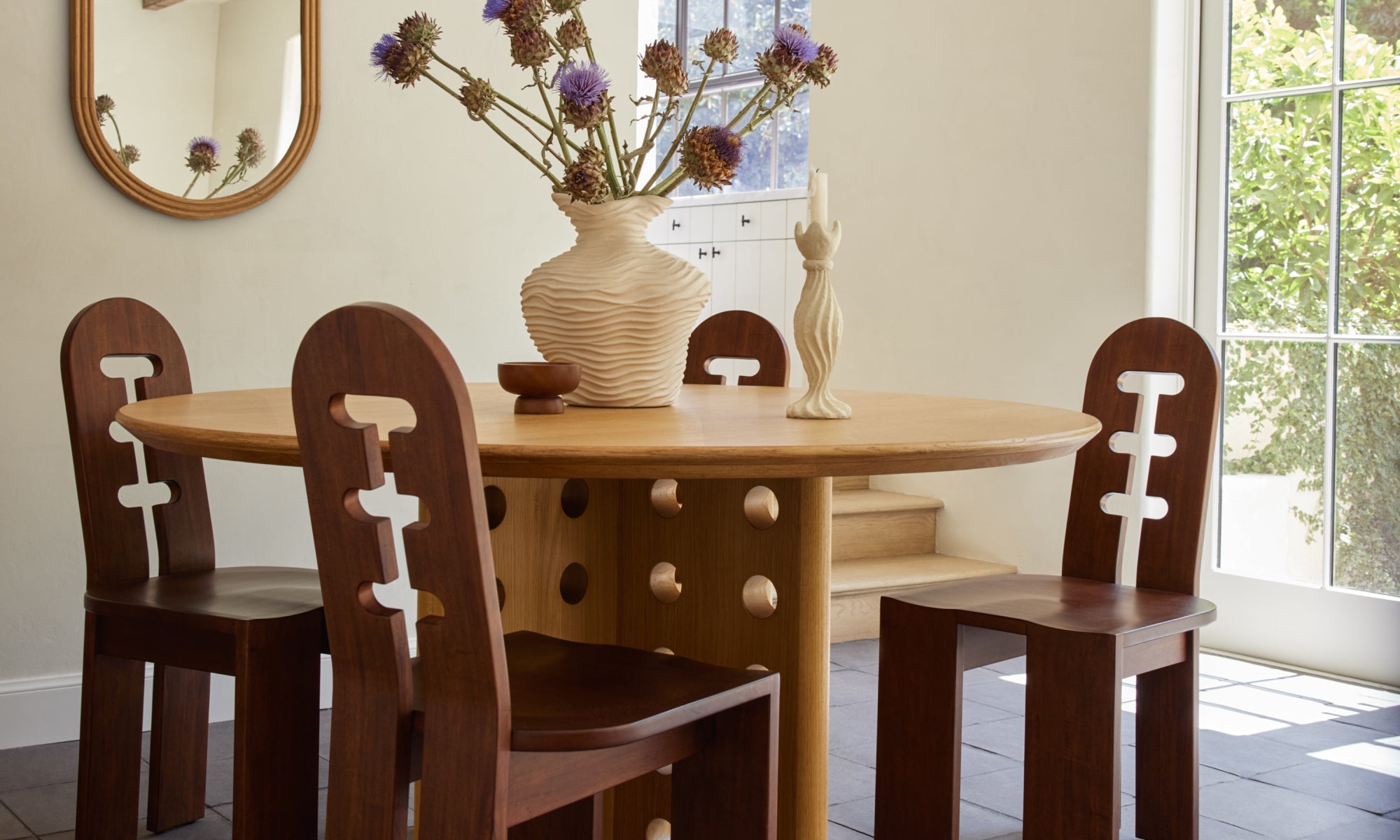 Carved details and layered wood grains bring sculptural drama to this dining space, setting a modern table with the perfect touch of warmth and whimsy.