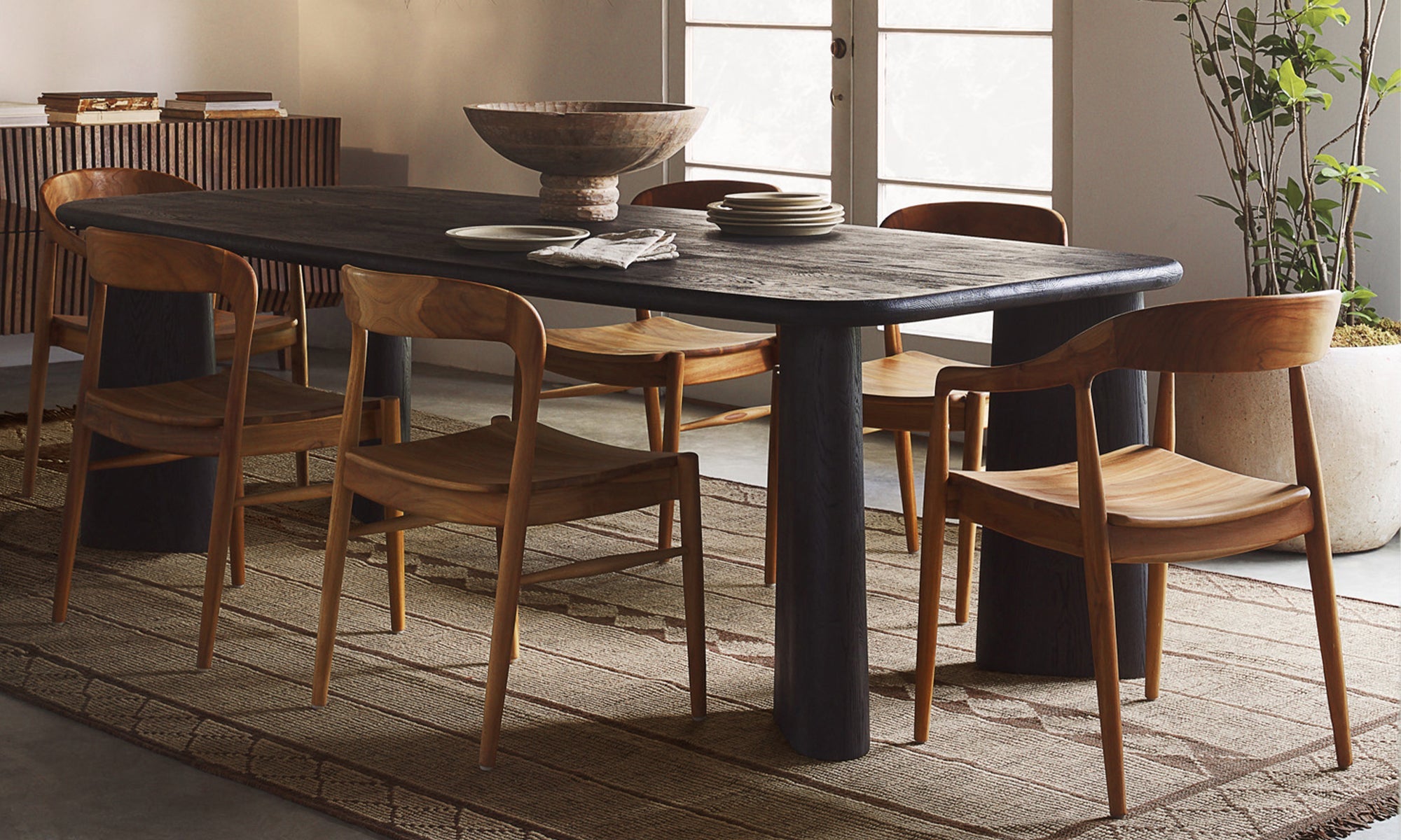 Dark finishes, an abundance of texture, and natural materials help ground this dining room with a raw yet elevated look.