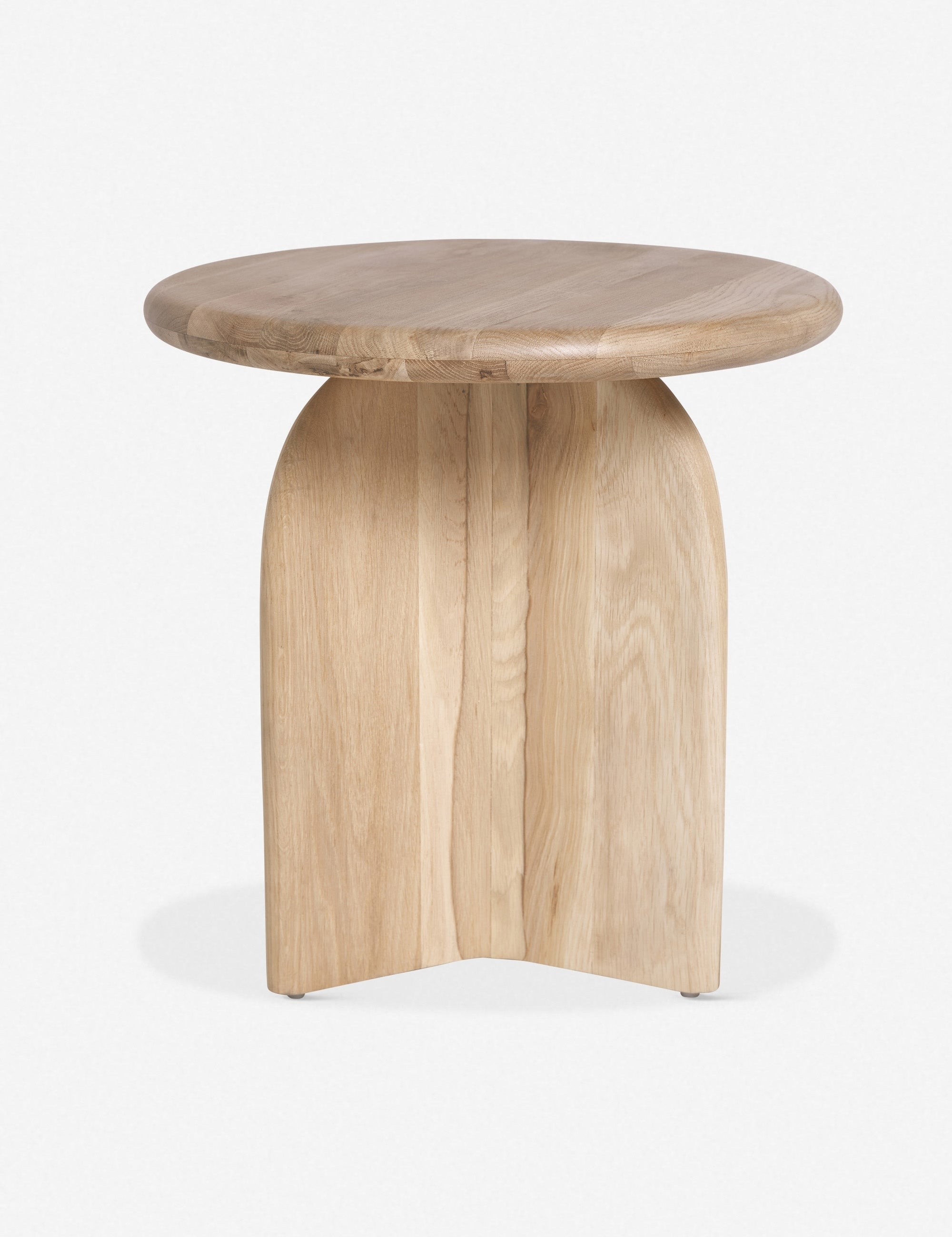 Sculptural and dynamic, the Ada Round Side Table design makes it feel as though its round tabletop sits in perfect balance atop its curved base. This end table is constructed from solid oak with beautiful variations in the grain. Style this wood side table next to a clean-lined sofa or in a reading nook beside a favorite chair.