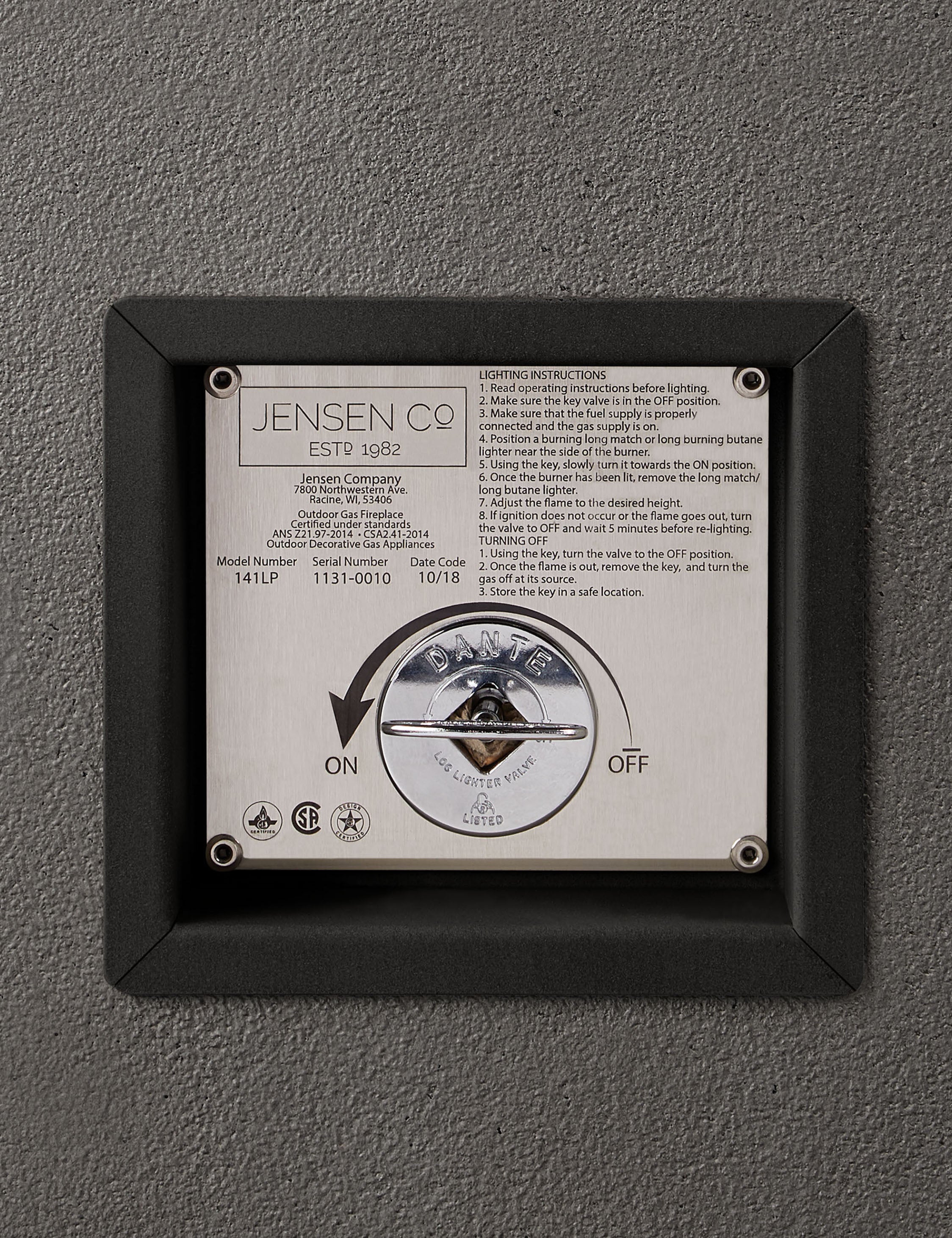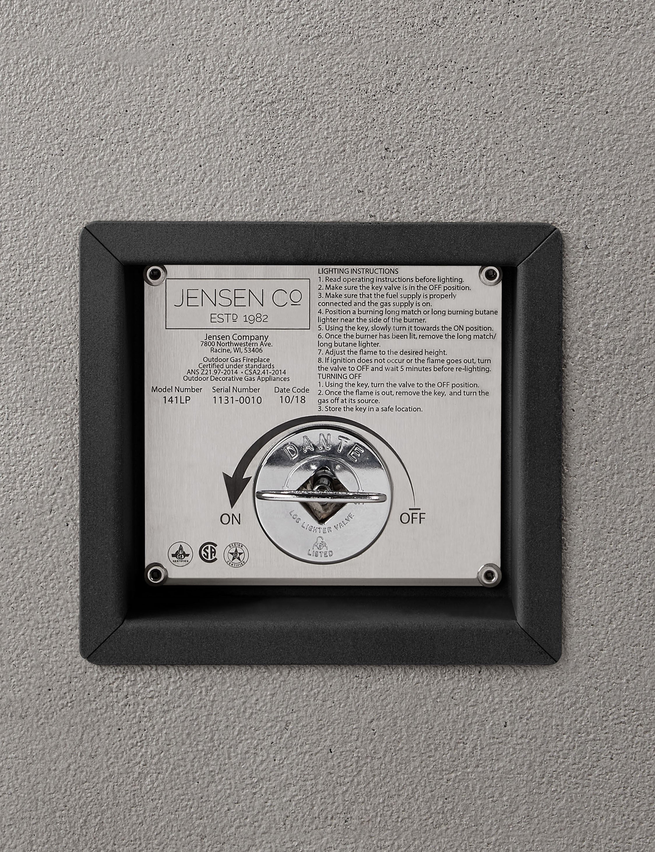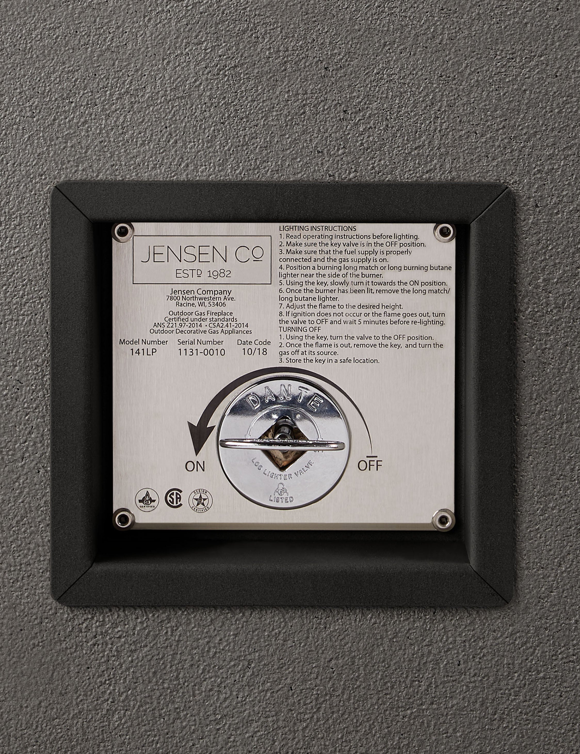 - Includes fire table with brass burner, black lava rock filler, valve key, polyester storage cover and 8' NG hose with quick connect socket