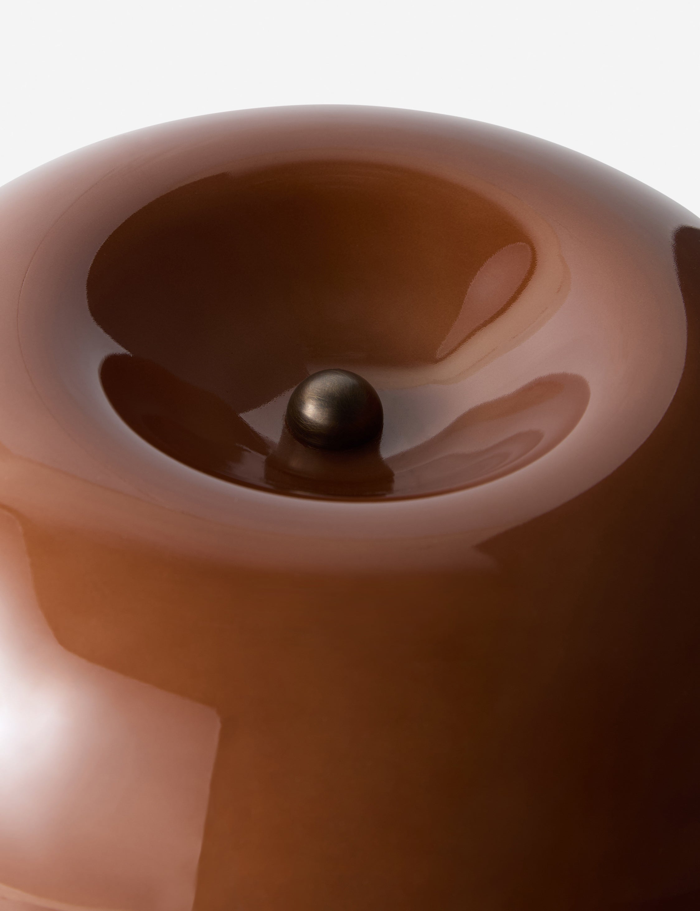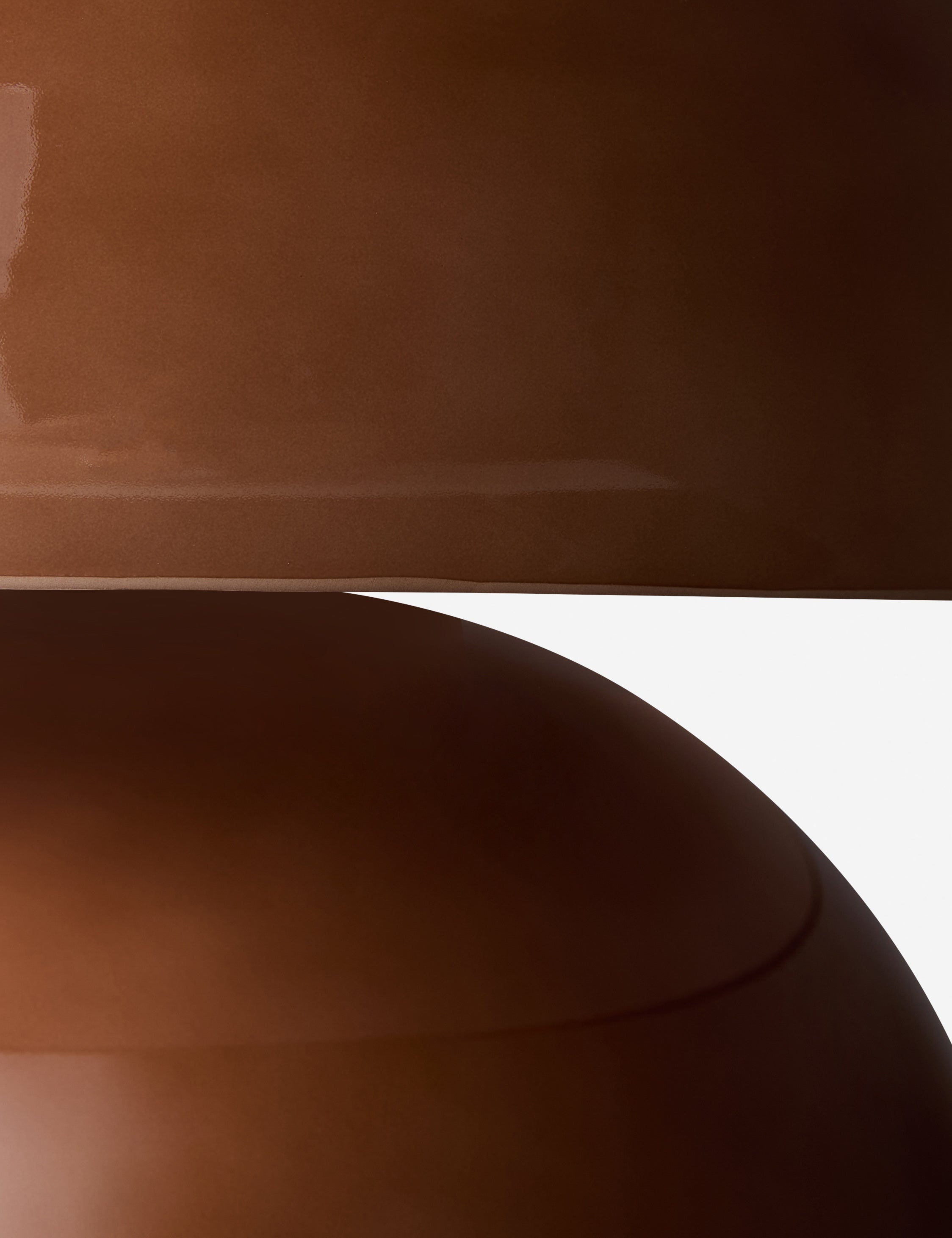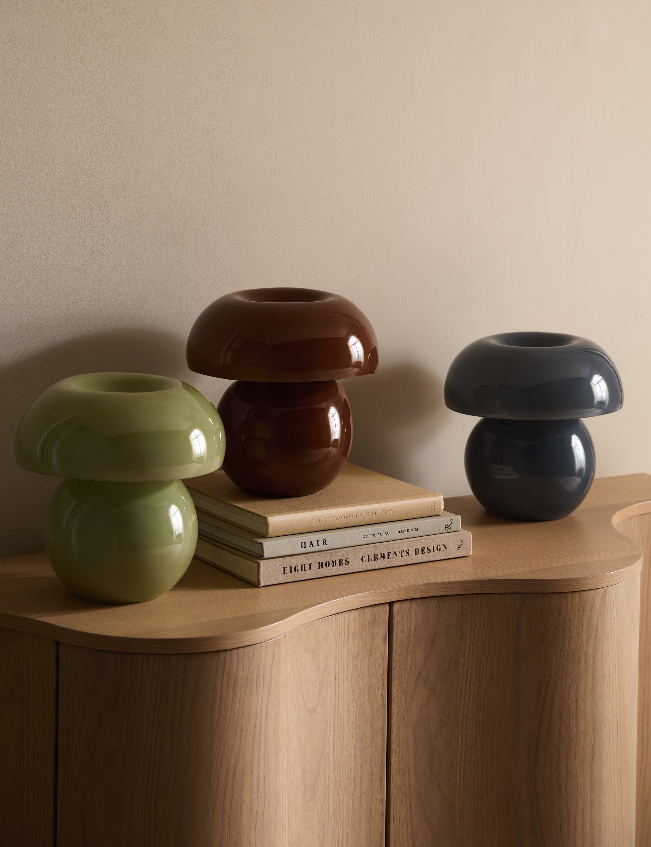 A nod to 1970s design, the Bobbin table lamp makes a bold impression with its mushroom-inspired silhouette. The monochromatic glass gives it a sleek, sculptural presence, while the compact size makes it a versatile lamp for living room or bedside styling. We love the rich touch of color and warmth this piece brings to any curation.