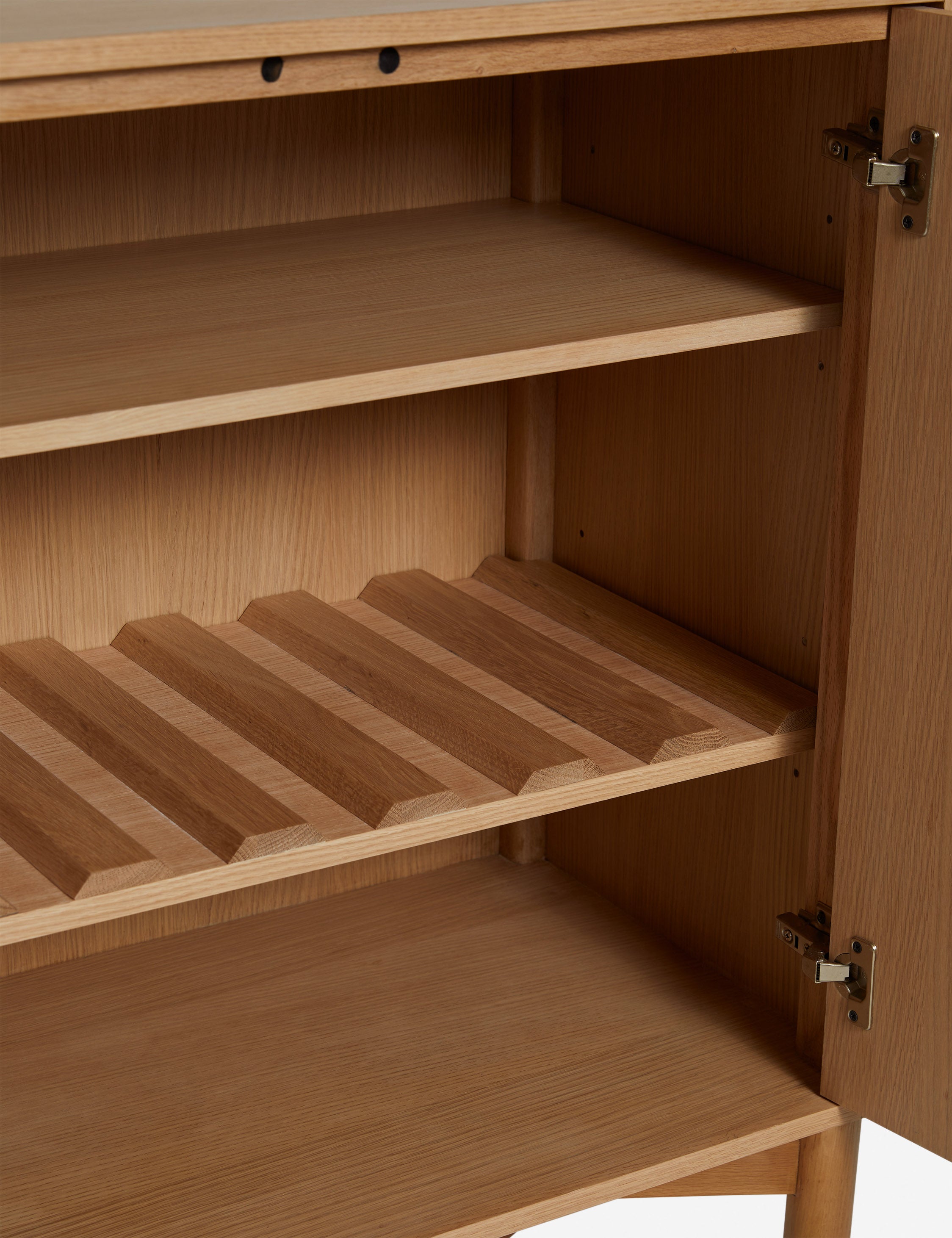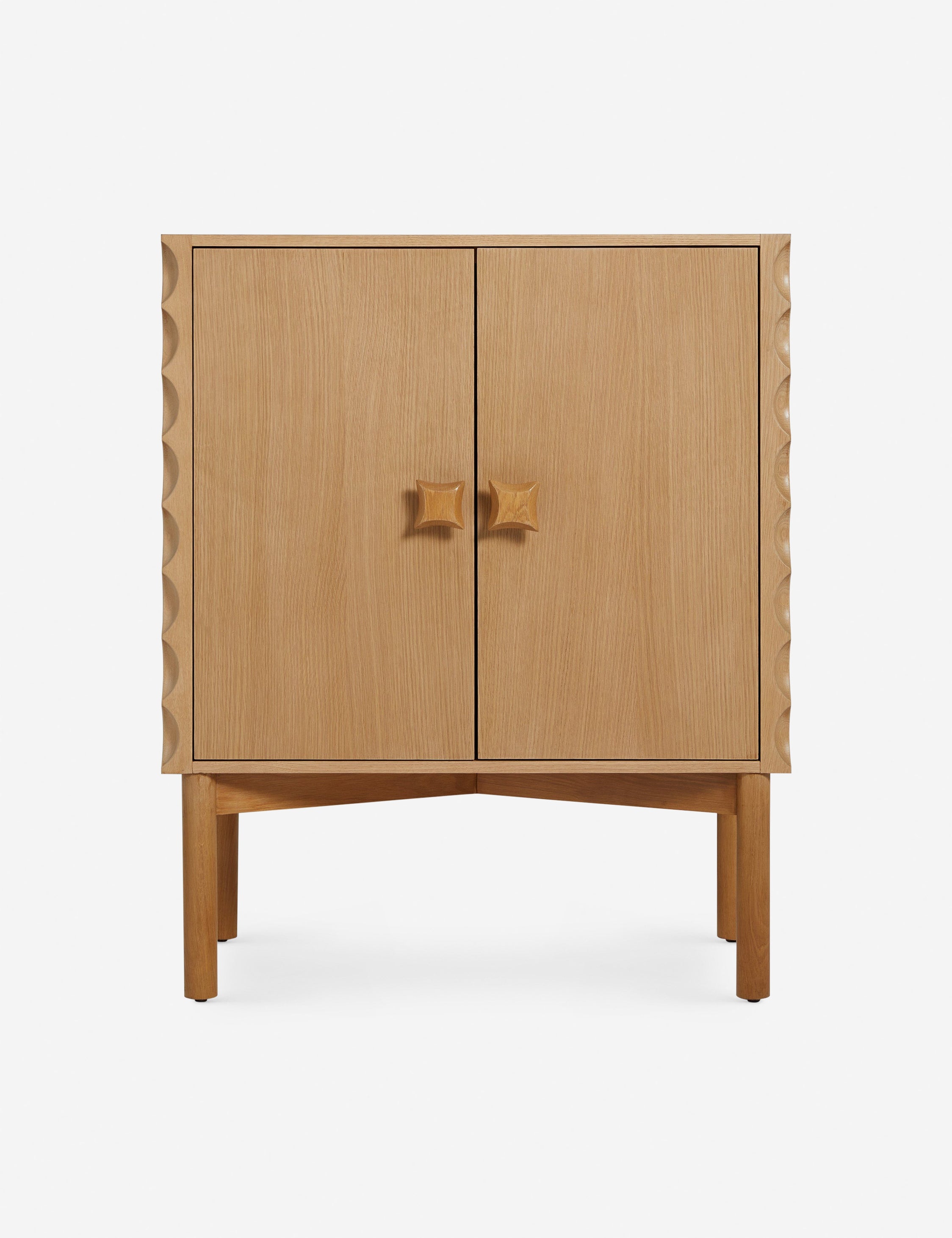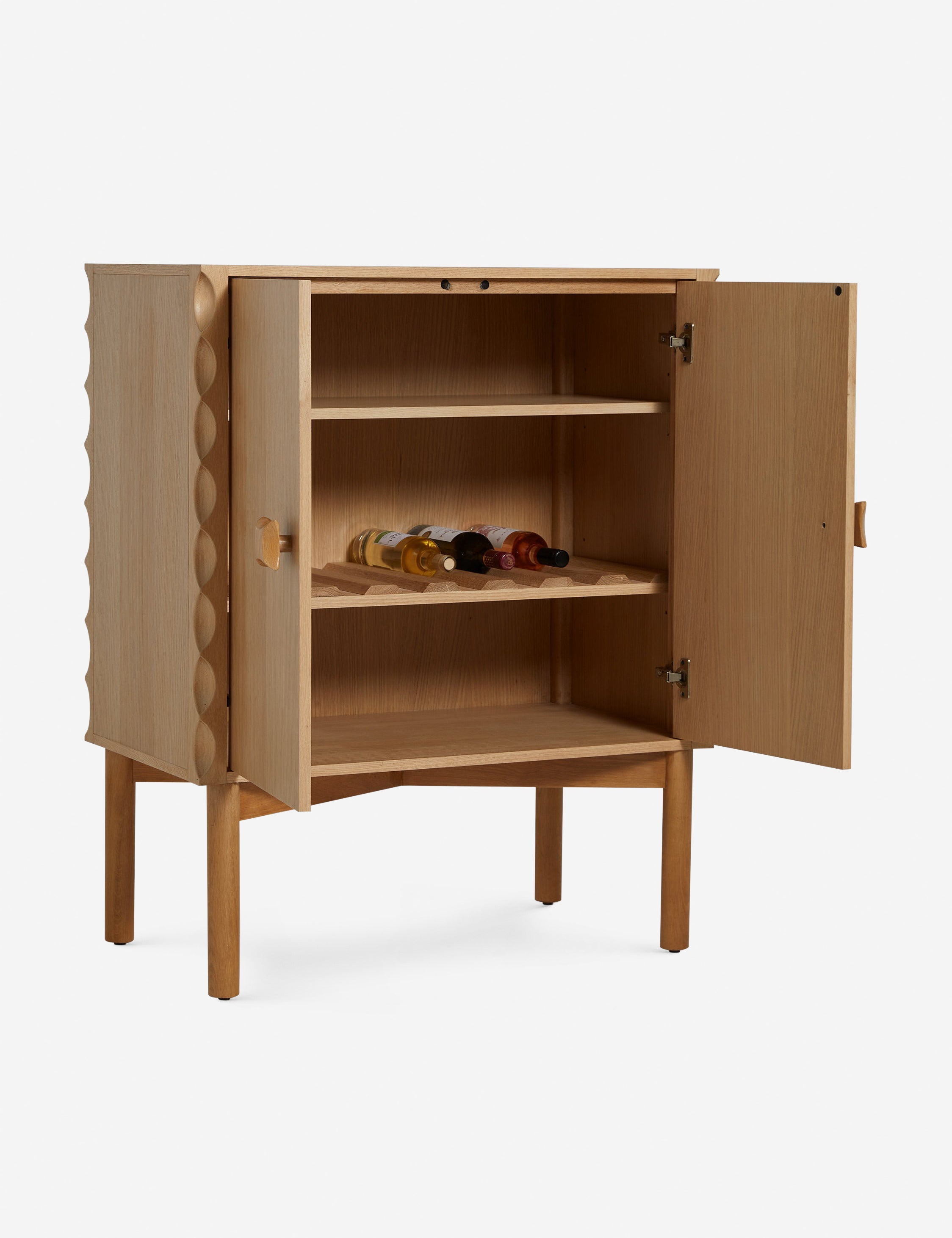 Eny Lee Parker brings her thoughtfully grounded approach—an embrace of slowness, intention, and respect for nature—to an exclusive collection with Brightselects. The Cami bar cabinet casts a stylish profile with its natural oak grain and corner detailing. Inside, a reversible wine shelf brings functional appeal to the elegant form.