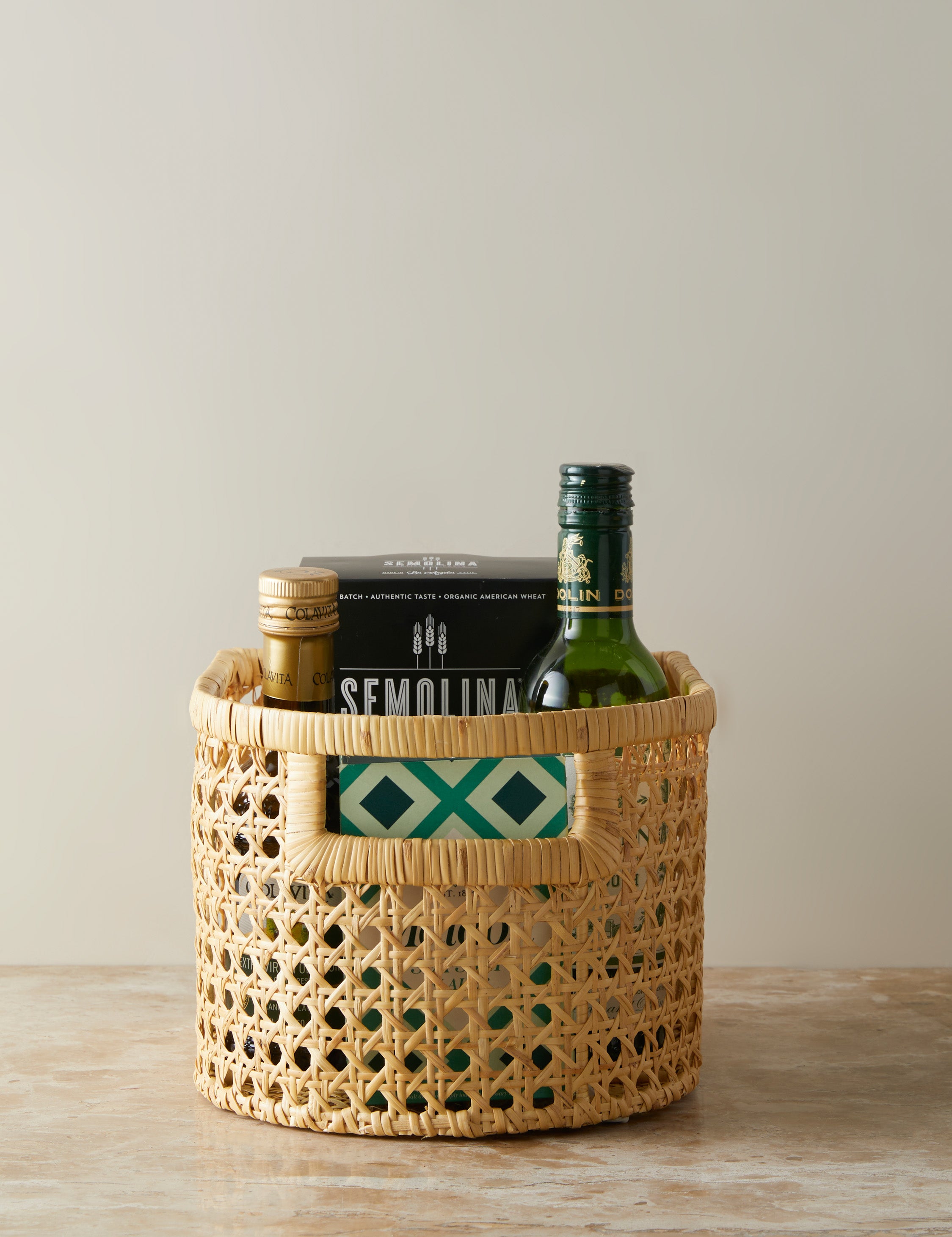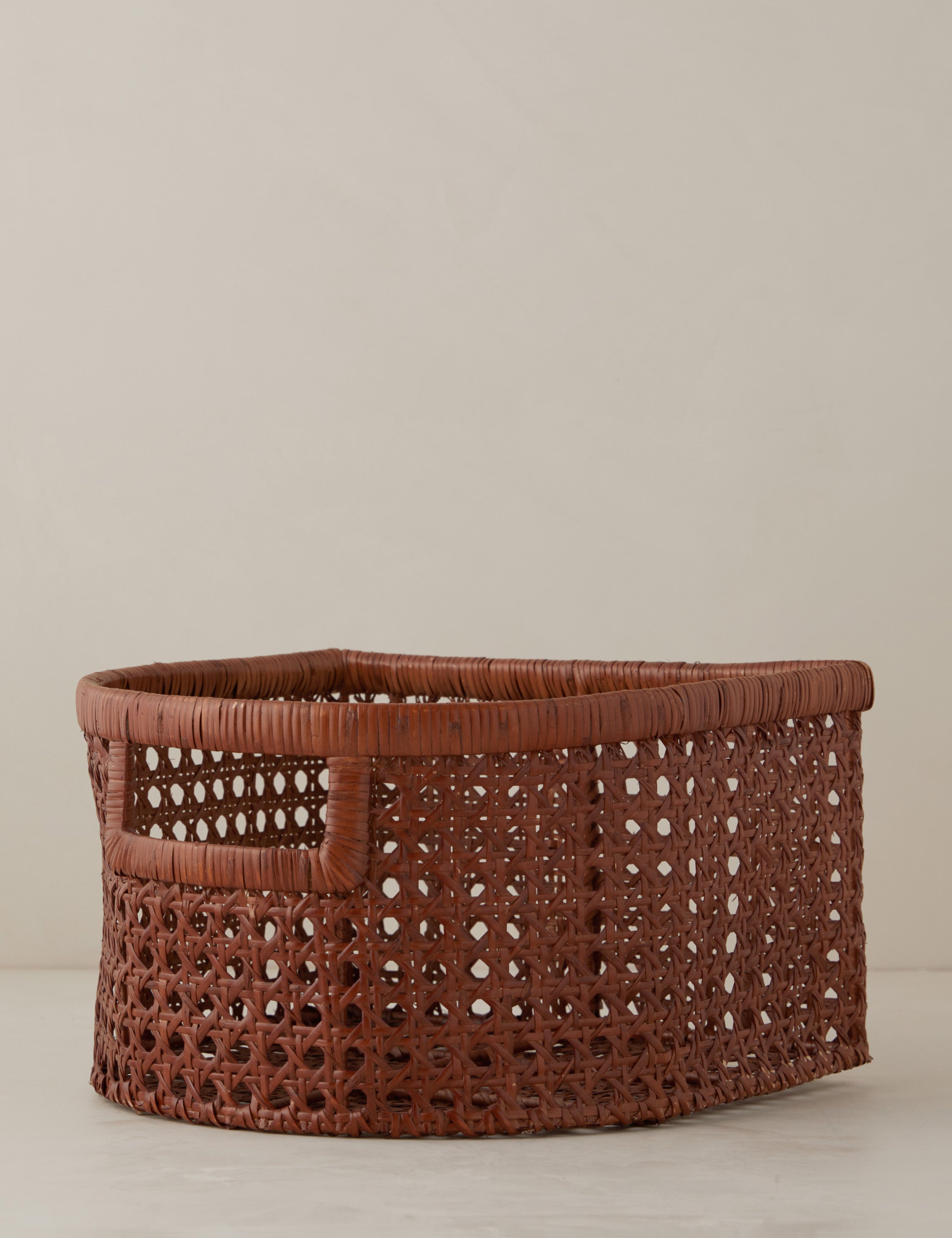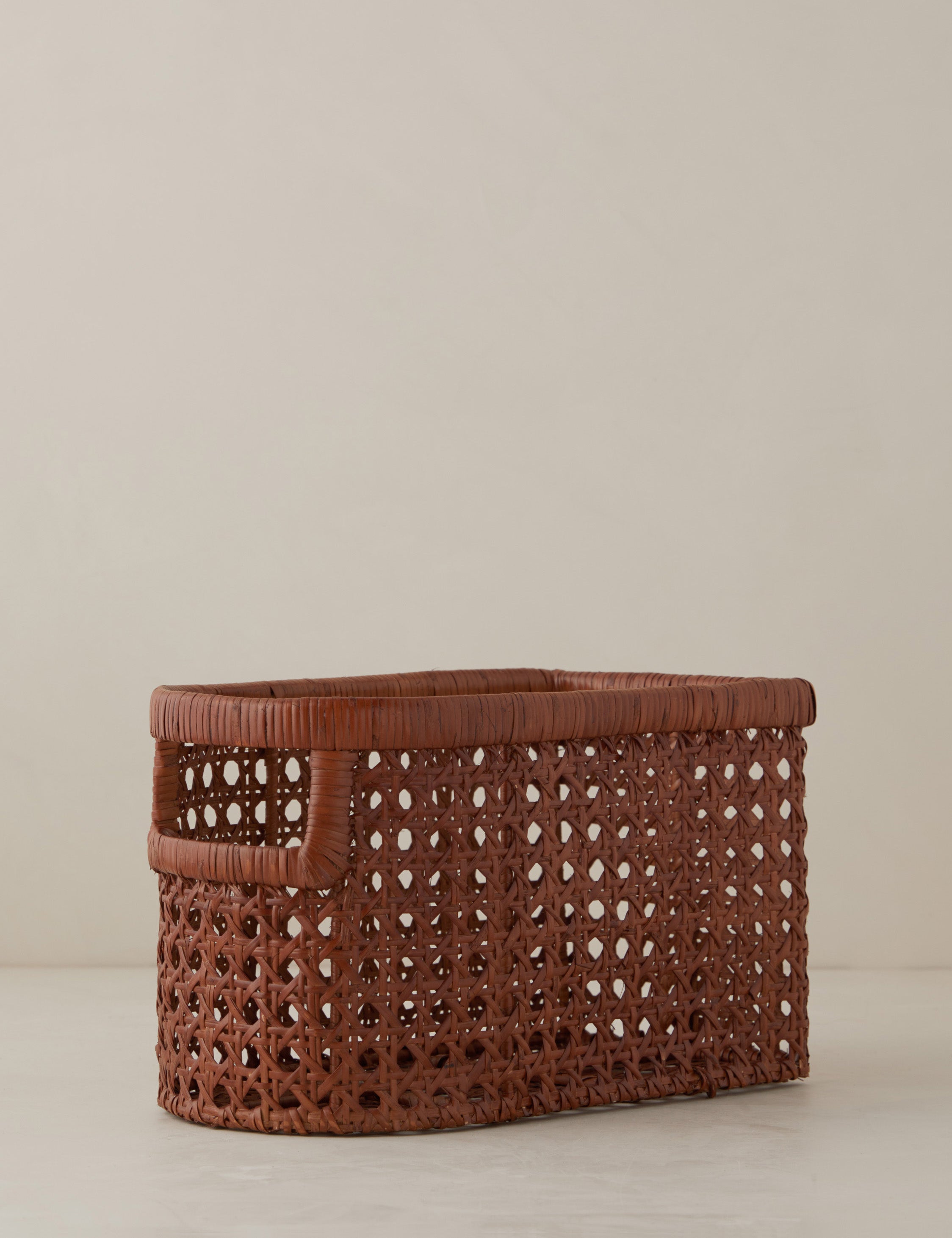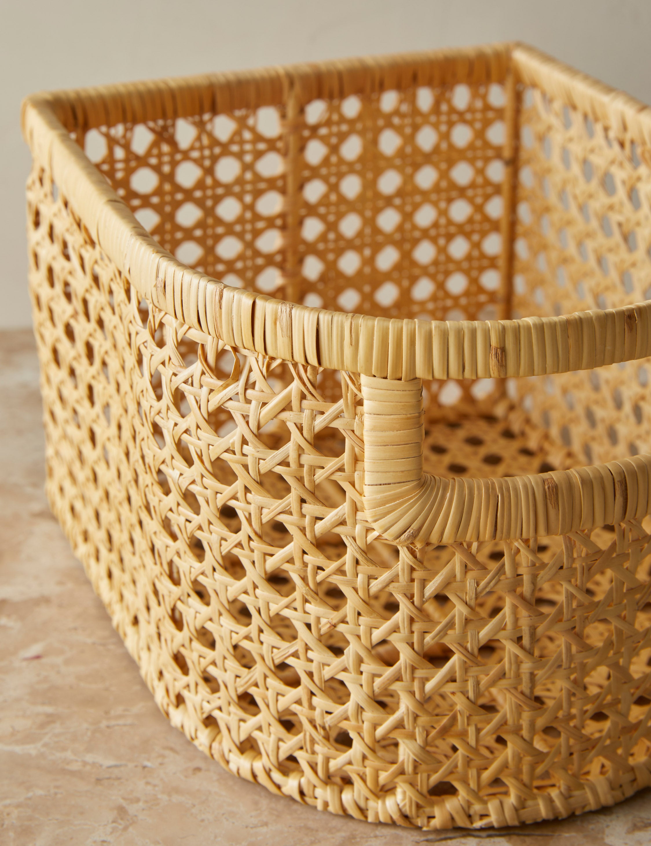 Bring some natural warmth and texture to tabletop storage with this cane basket. The flat-back shape saves space on counters and shelves with a front-facing handle for a practical touch. This piece is from our exclusive Sarah Sherman Samuel collaboration and features all the trademarks of her warm, edited style.