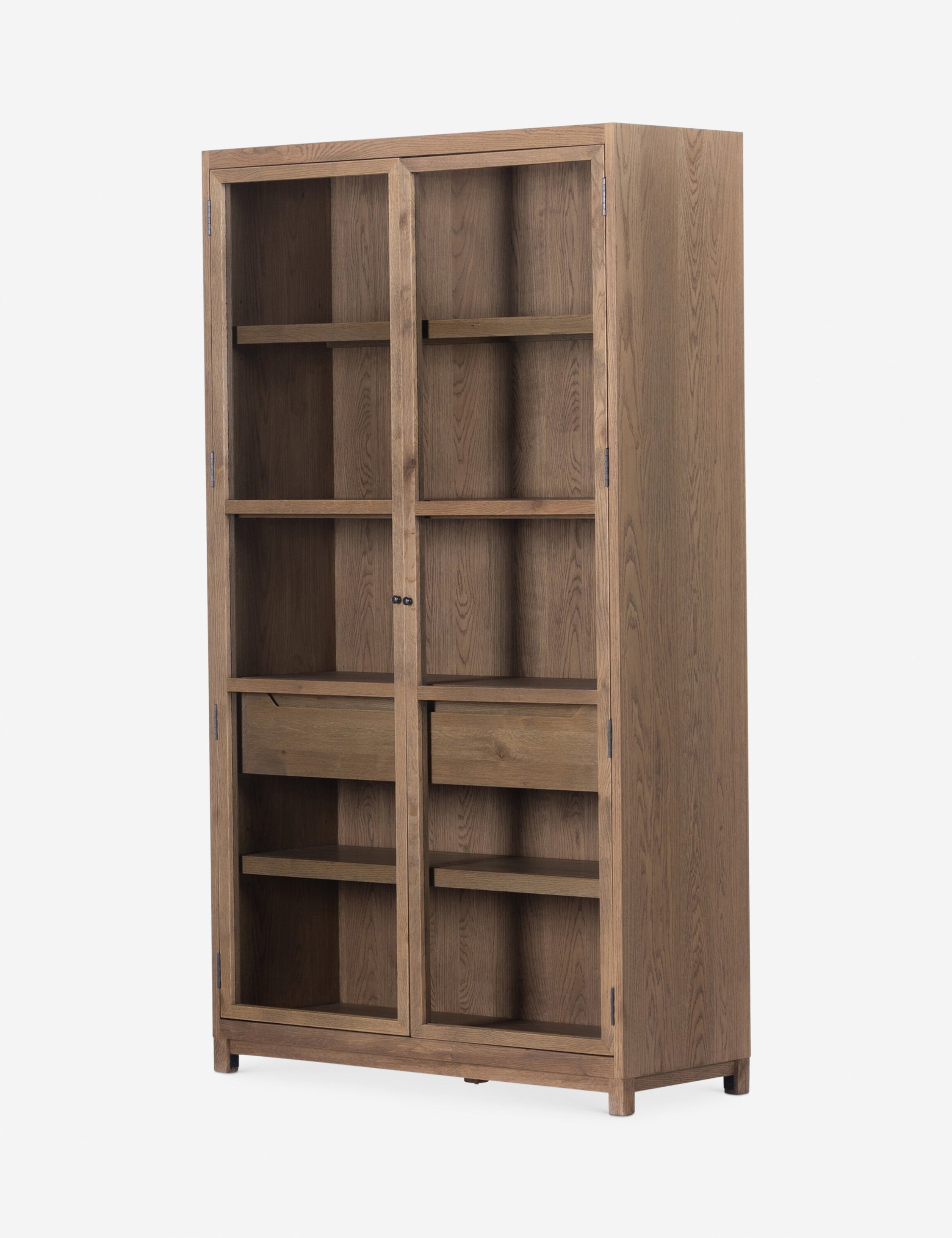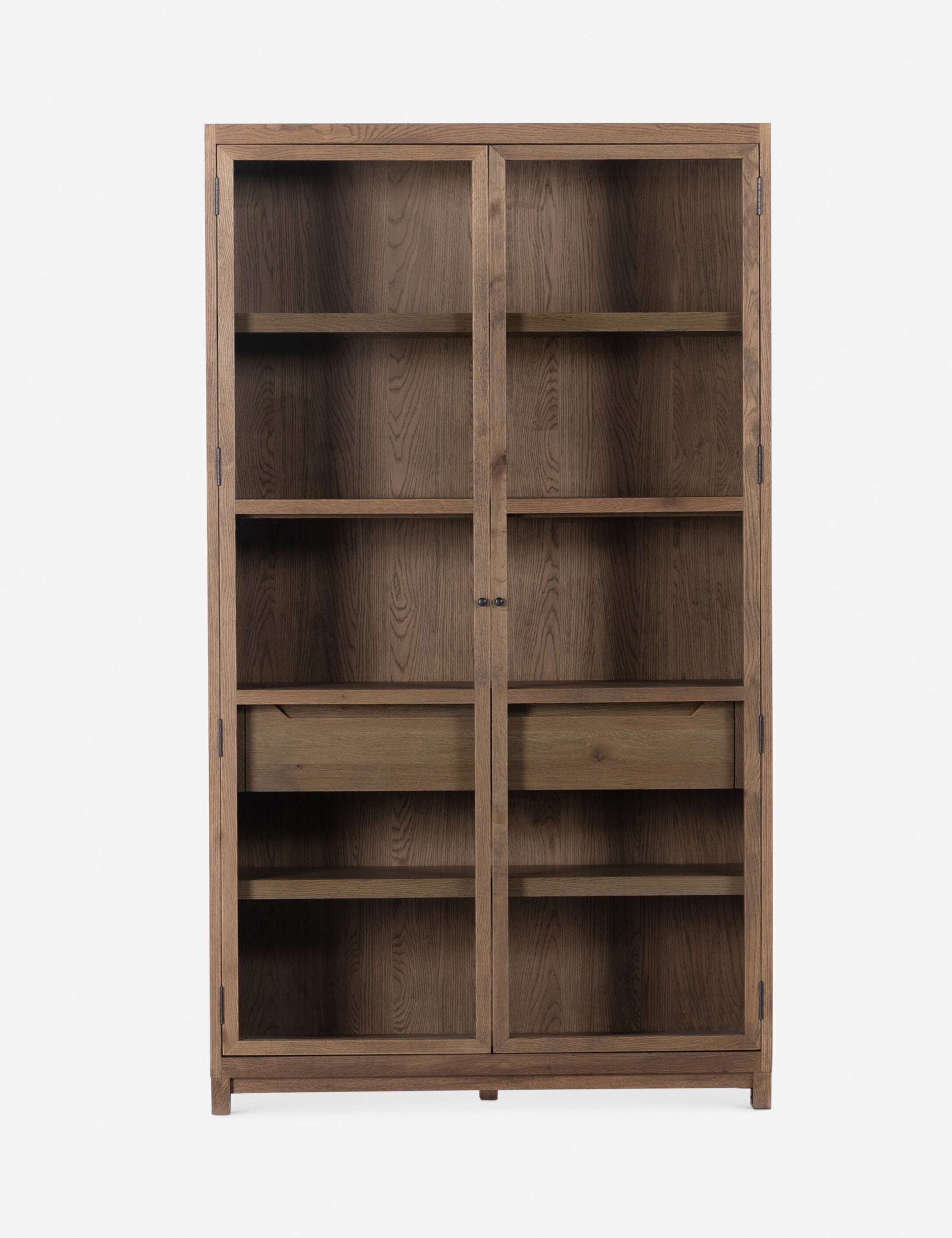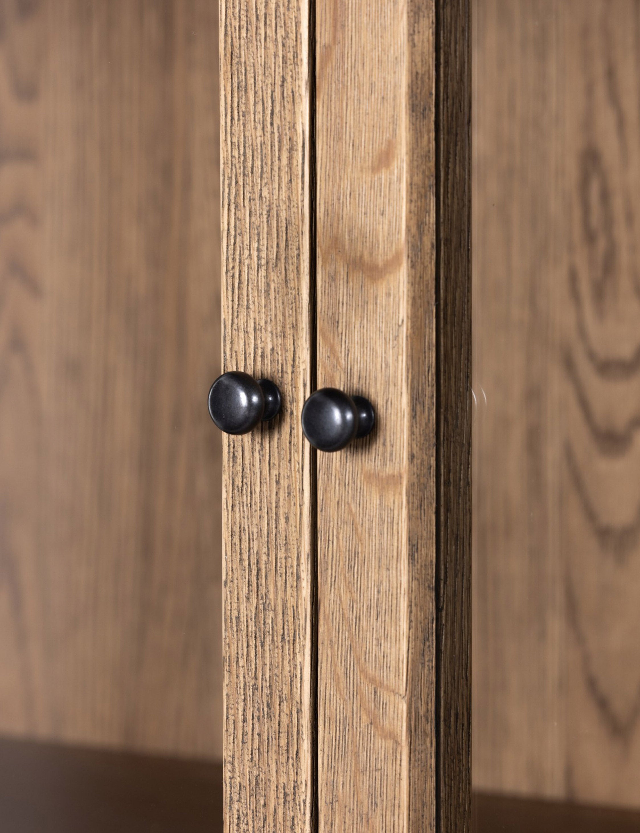 A transitional double cabinet with glass doors and a timeless oak frame. We love how this design offers spacious shelving for curated displays with an interior drawer for a touch of concealed storage. Fill this piece with favorite dishes and linens in your dining room or books, decor, and more for a home office or lounge.