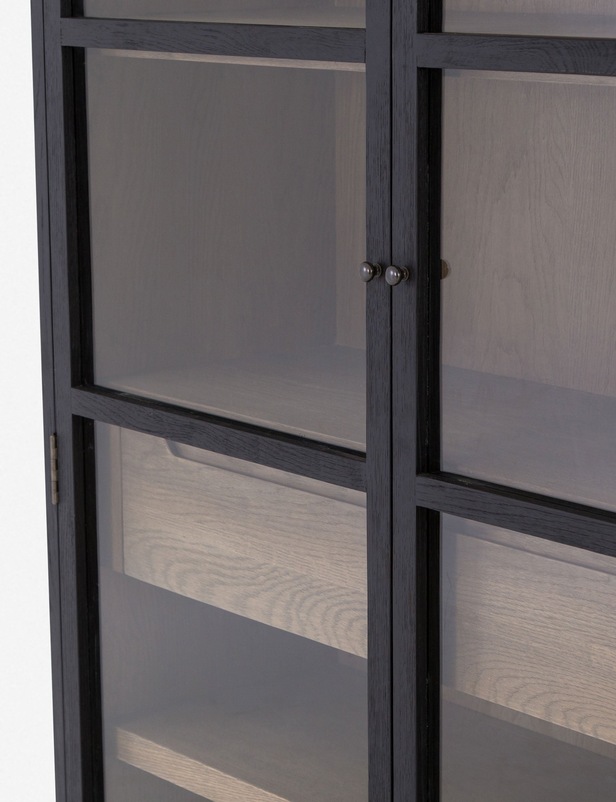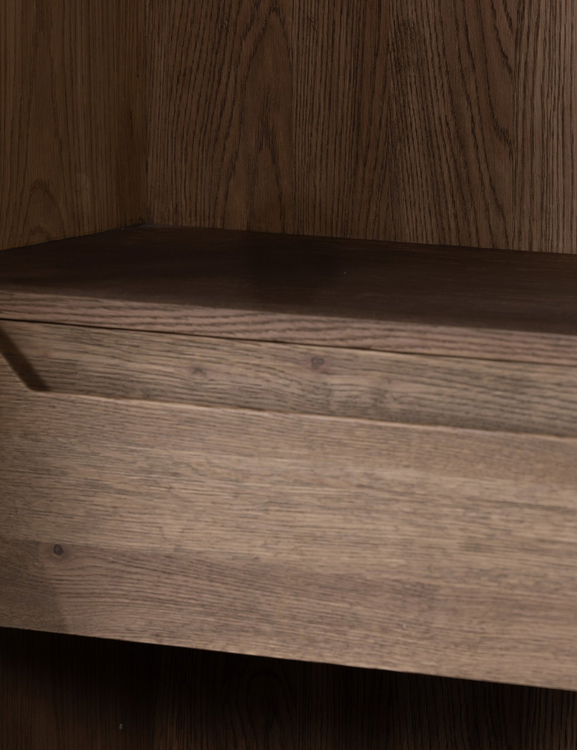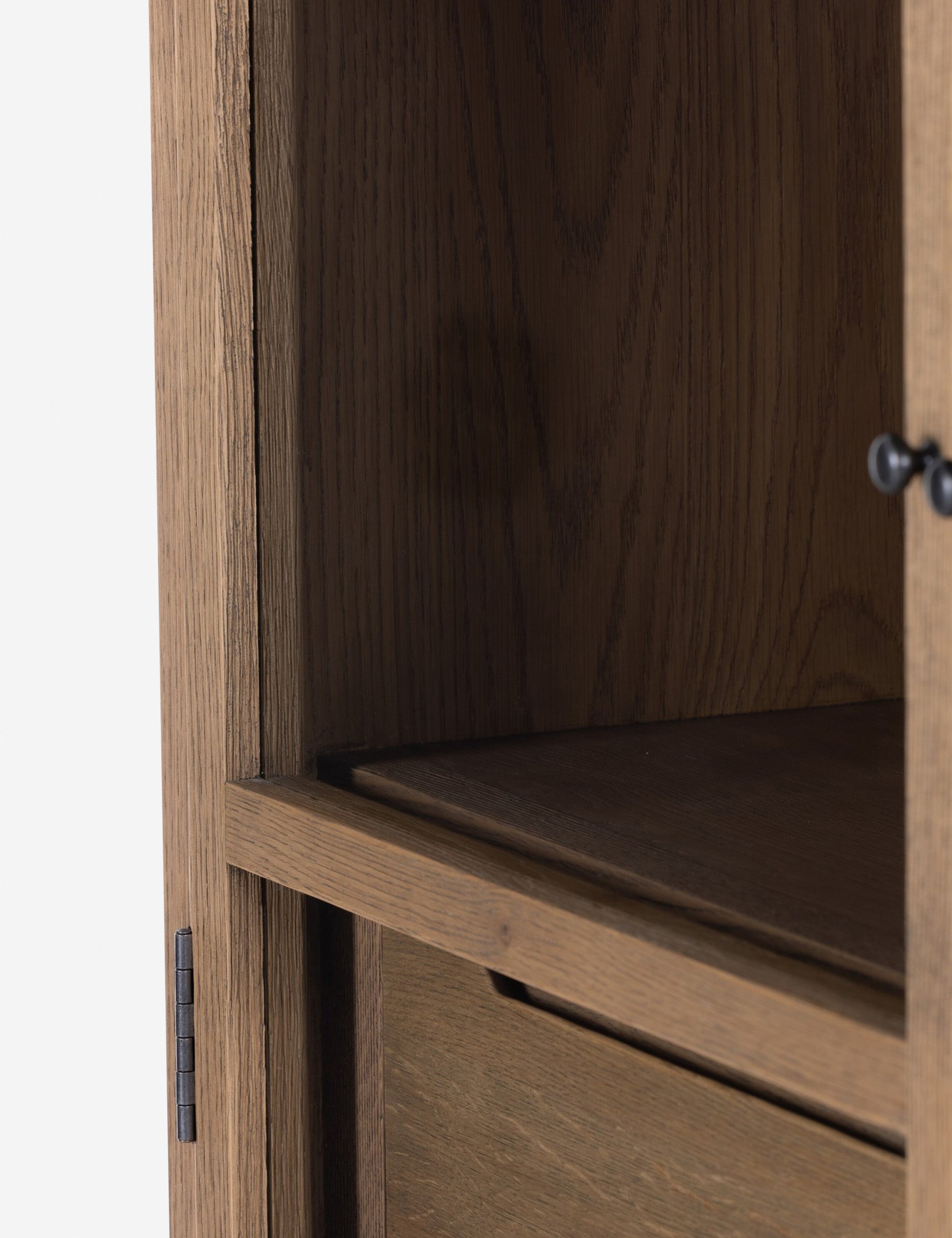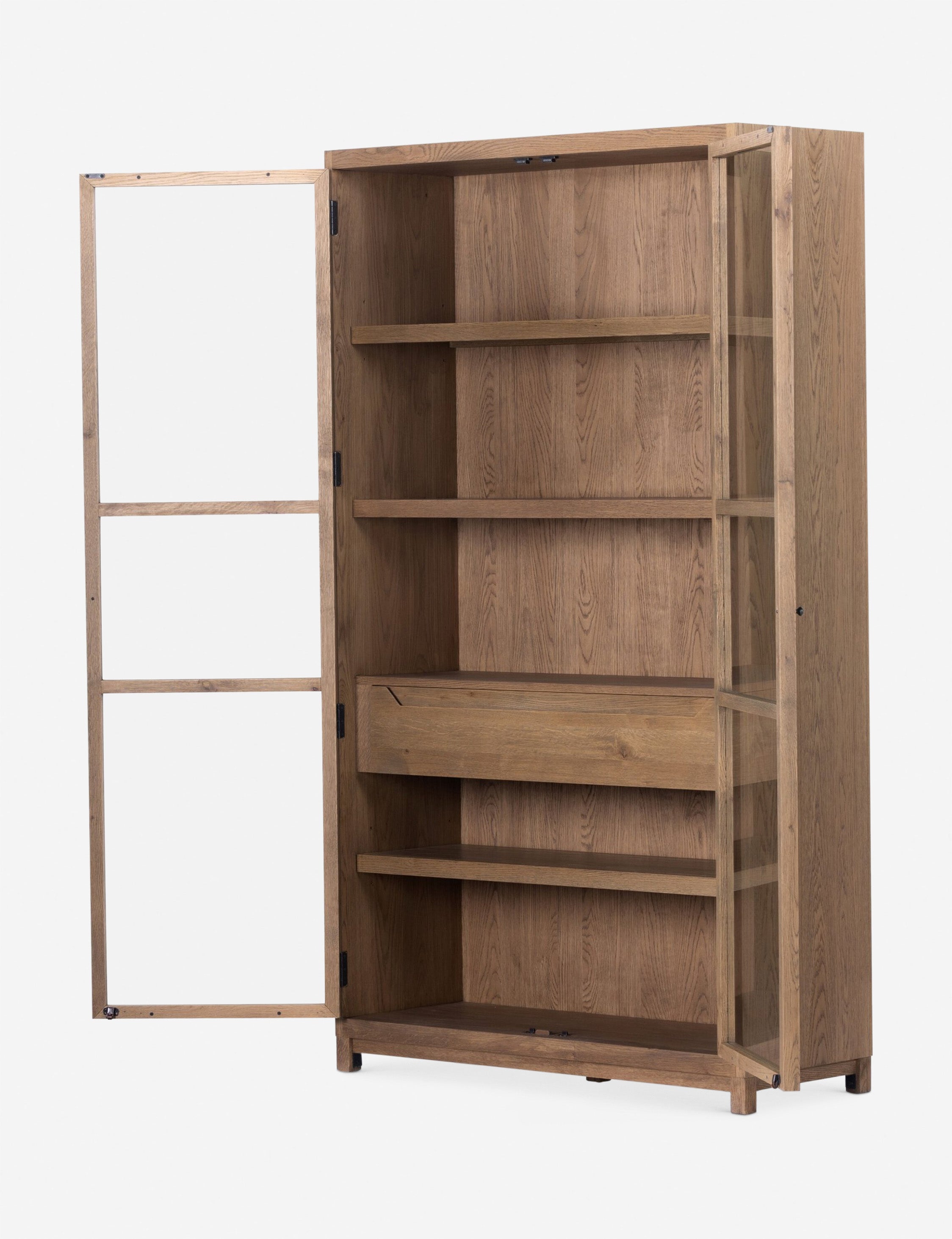 A transitional double cabinet with glass doors and a timeless oak frame. We love how this design offers spacious shelving for curated displays with an interior drawer for a touch of concealed storage. Fill this piece with favorite dishes and linens in your dining room or books, decor, and more for a home office or lounge.