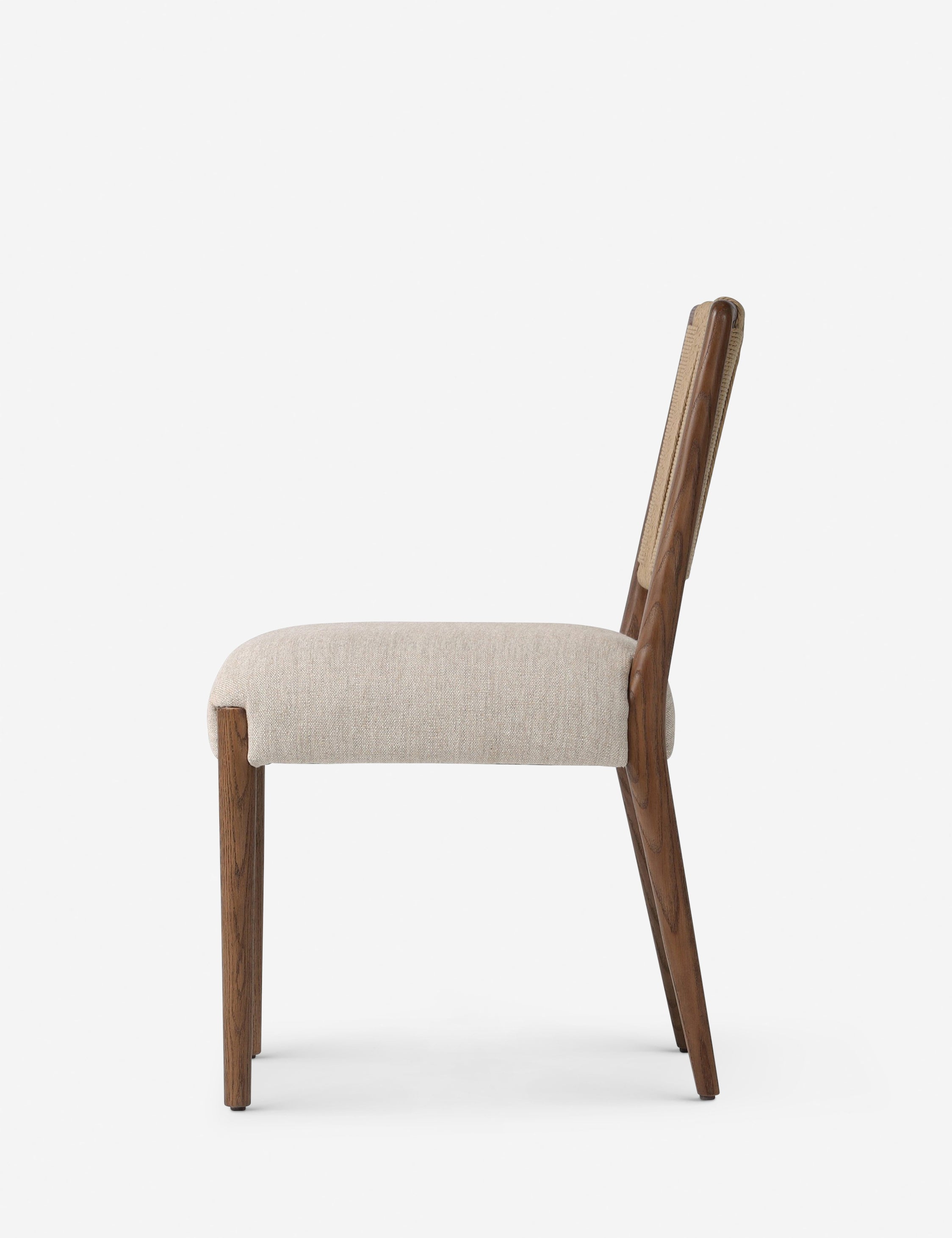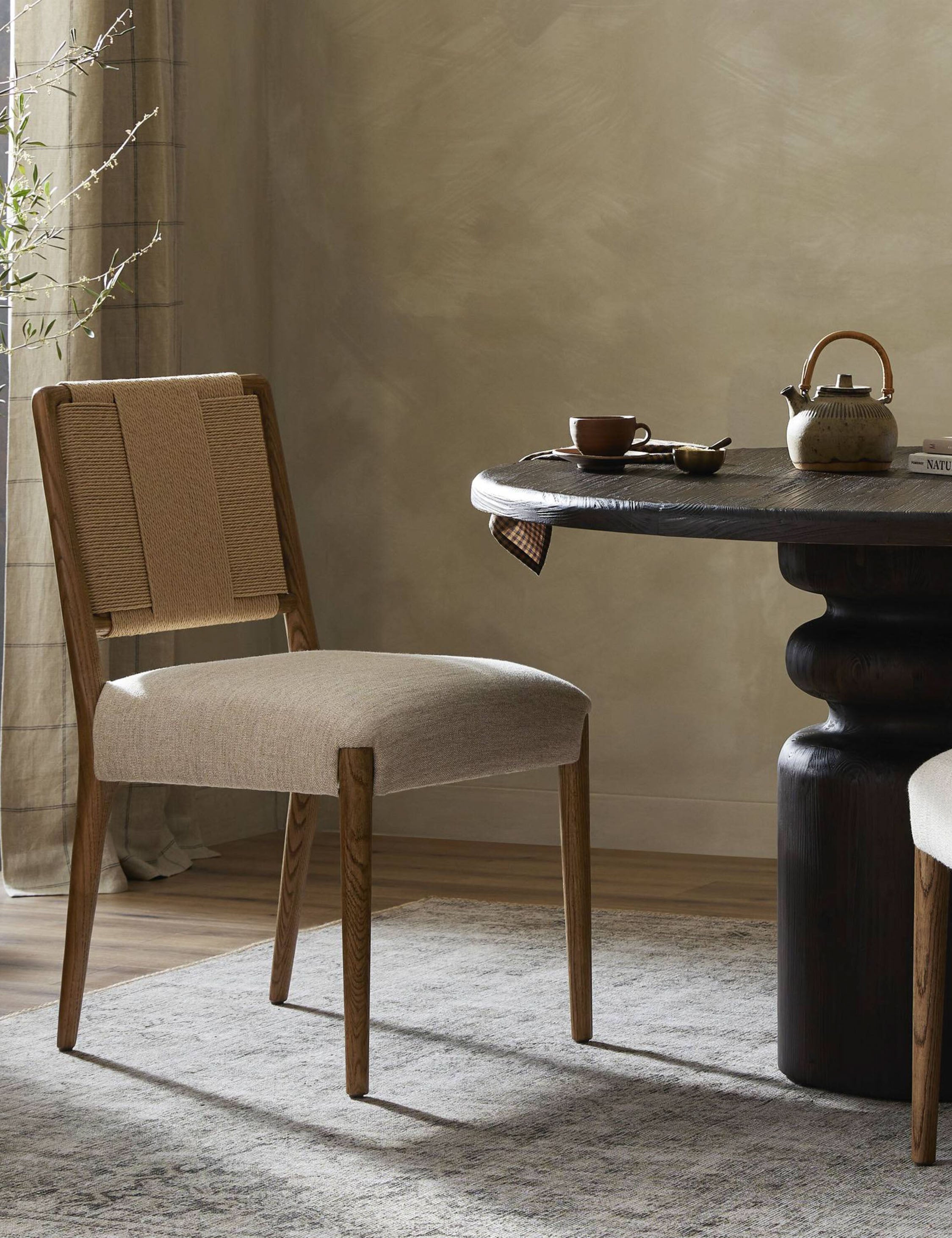 The Fenmore dining chair showcases fine craftsmanship with a mixed-material design. An alternating weave on the backrest creates layered texture, while performance upholstery styles this dining seat for everyday elegance. A warm wood frame completes the look with a natural grain touch perfect for transitional decor.