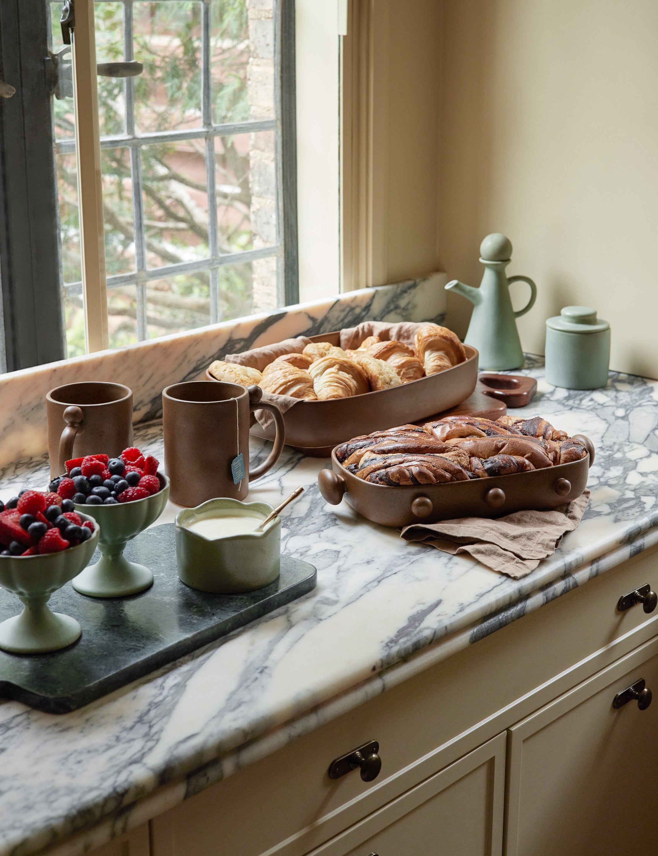 The Julep collection brings a striking play of shape to both kitchen and table with unique stoneware silhouettes handcrafted by artisans. These scalloped ramekins are perfect for serving nuts, olives, and sauces or blending spices while cooking. This dishwasher and microwave-safe set is from our exclusive Sarah Sherman Samuel collaboration and features all the trademarks of her warm, edited style.