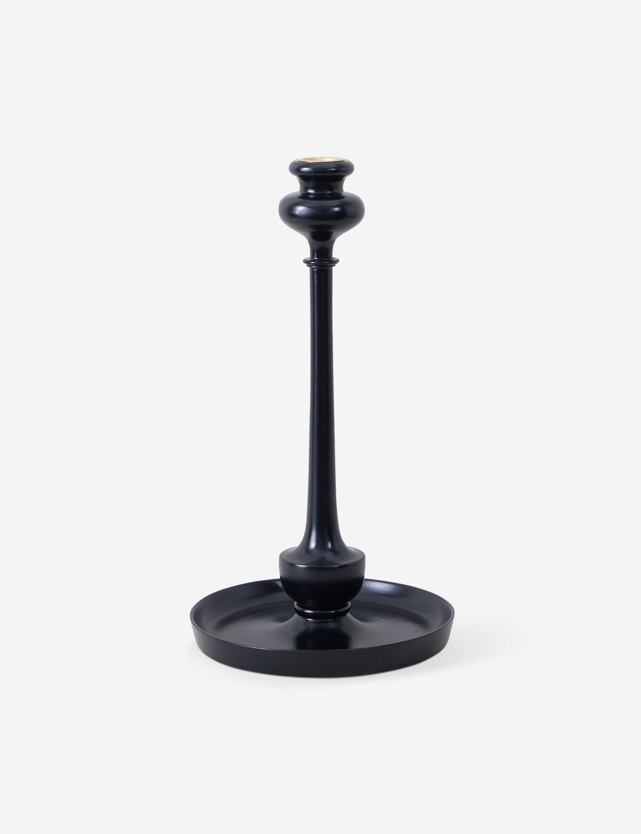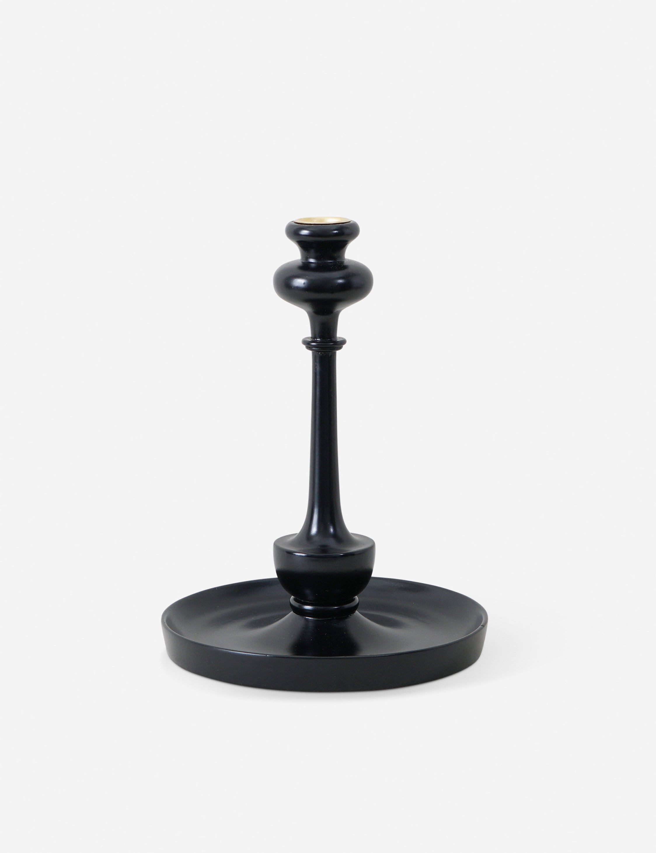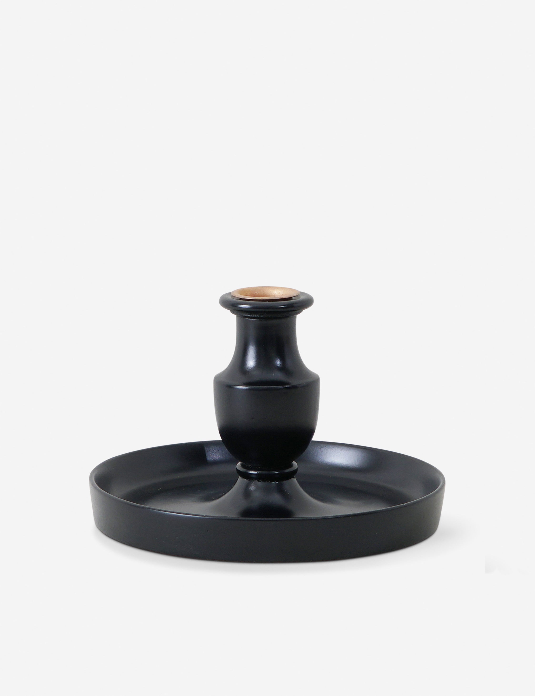Layer sleek, organic appeal into your tabletop decor with this wooden candlestick. The sculptural form is vintage-inspired and features a wide drip tray to catch wax. A black finish works to balance the classic notes with more modern appeal.