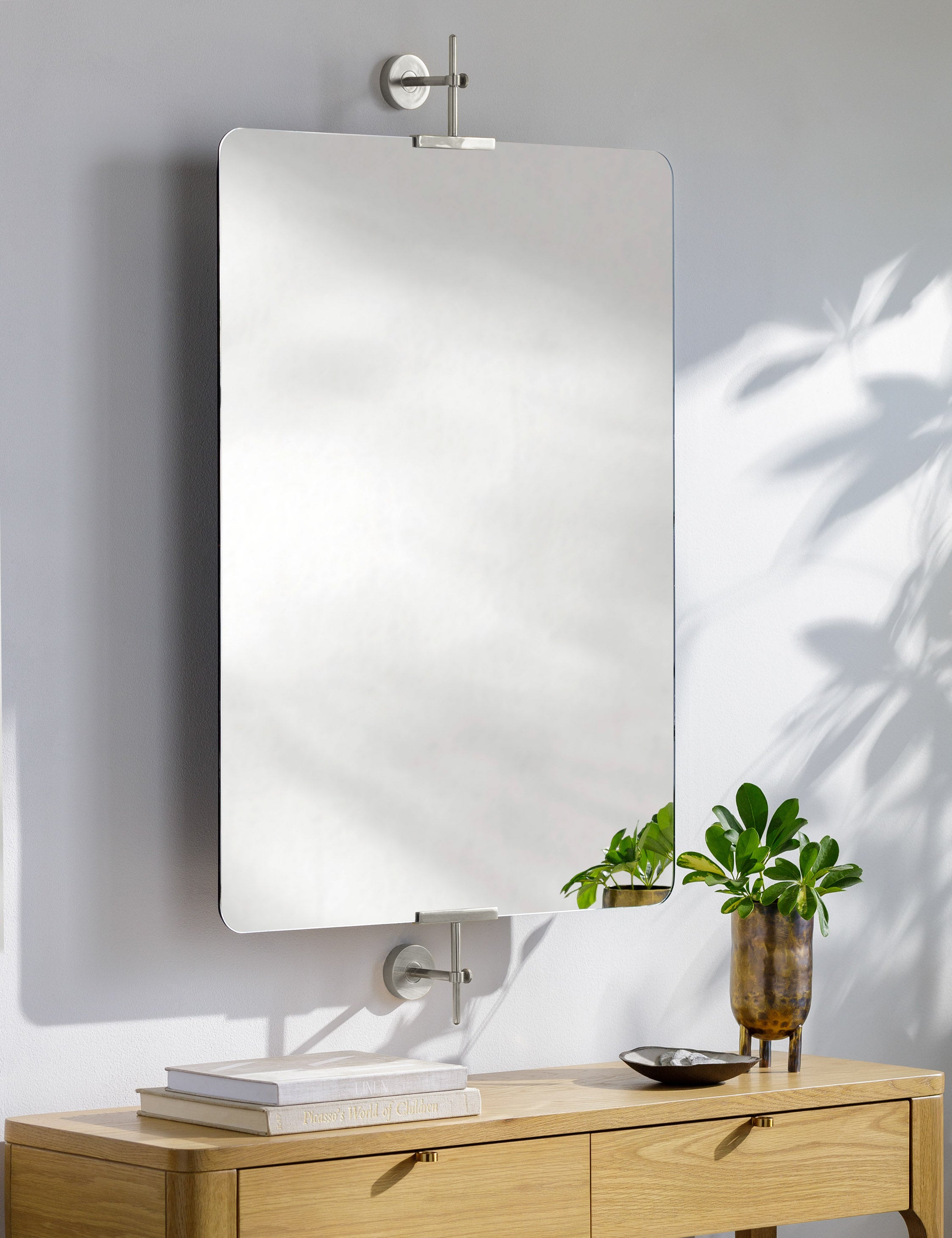 The Melle mirror styles vintage inspiration with a modern edge in its sleek yet striking design. Metal brackets offer an industrial detail while rounded corners soften the clean rectangular glass for a clean, minimalist feel. Place this accent mirror in a powder room, entryway, or living space for a timeless touch of polish.