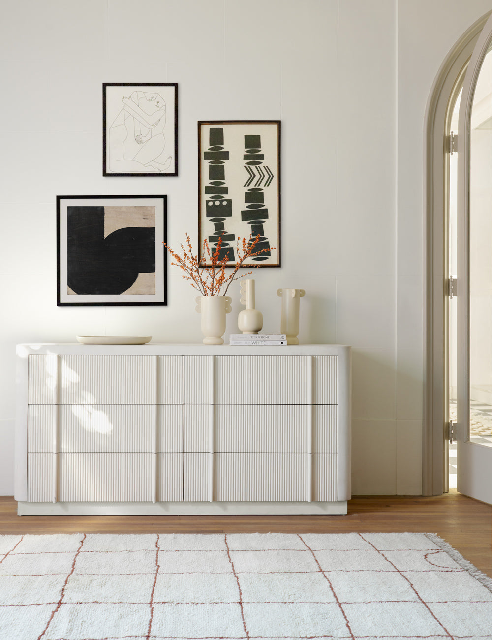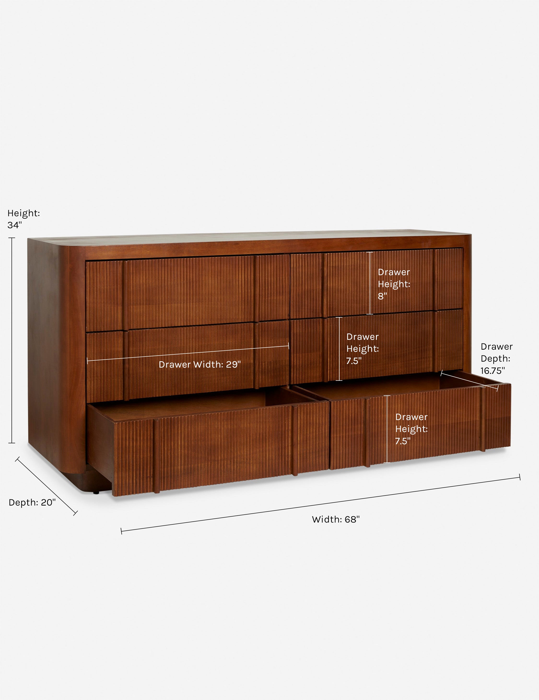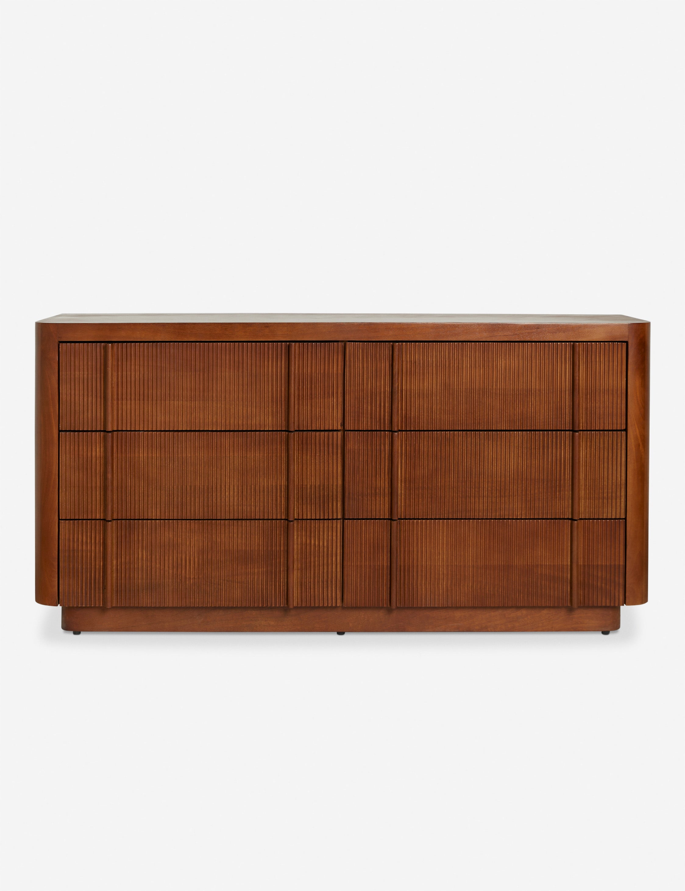 The Merrit dresser features a deco-inspired woodwork construction that pairs crisp, curving lines with ridged detailing and carved drawer pulls. Set on a plinth base, this dresser has six spacious drawers to add function and style to a transitional bedroom look. This piece is from our exclusive Sarah Sherman Samuel collaboration and features all the trademarks of her warm, edited style.