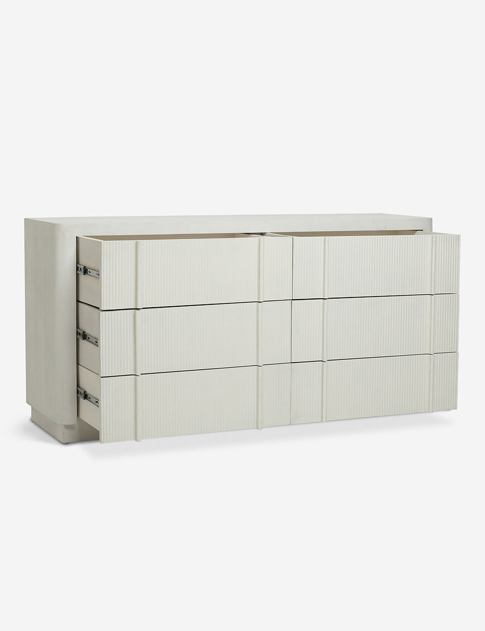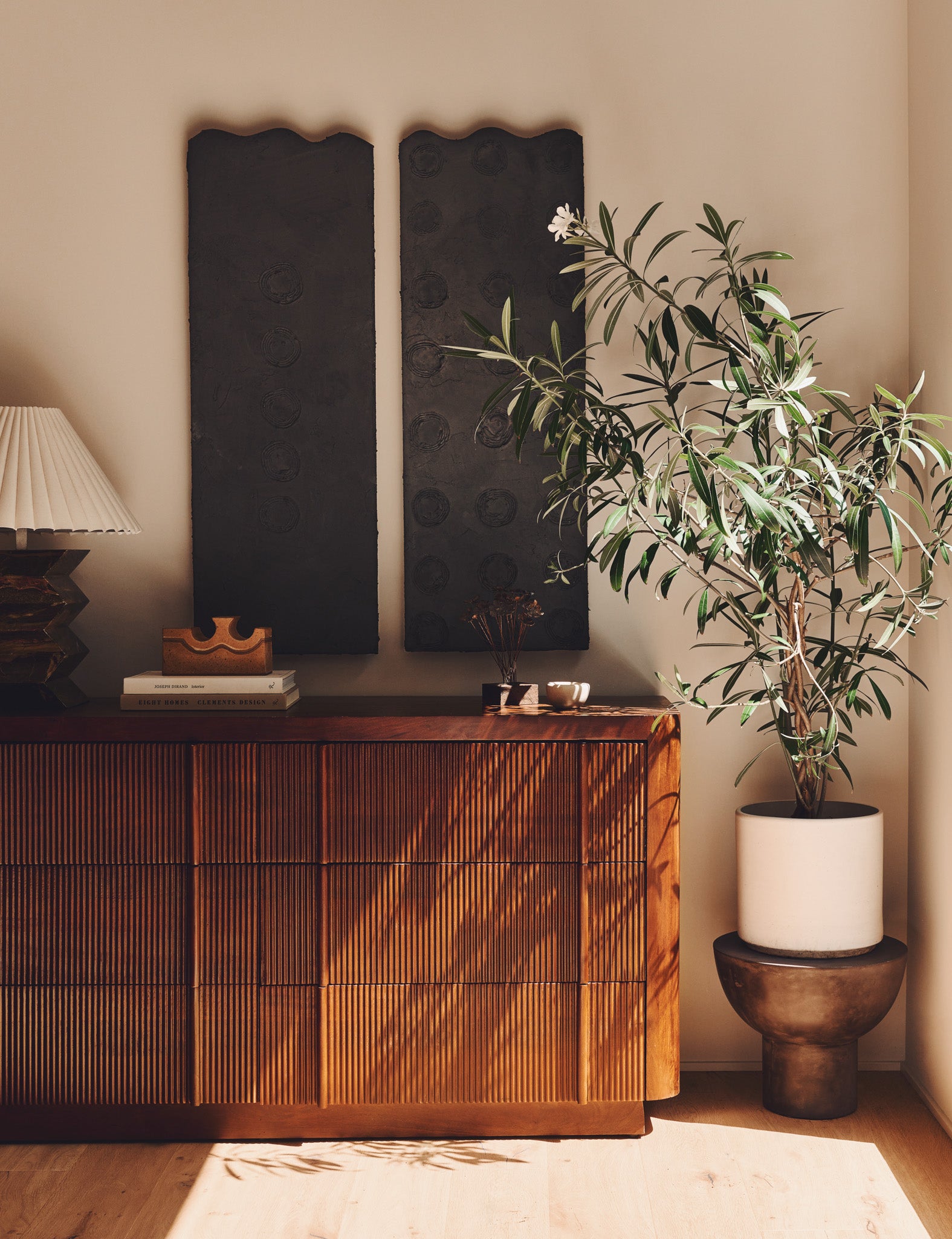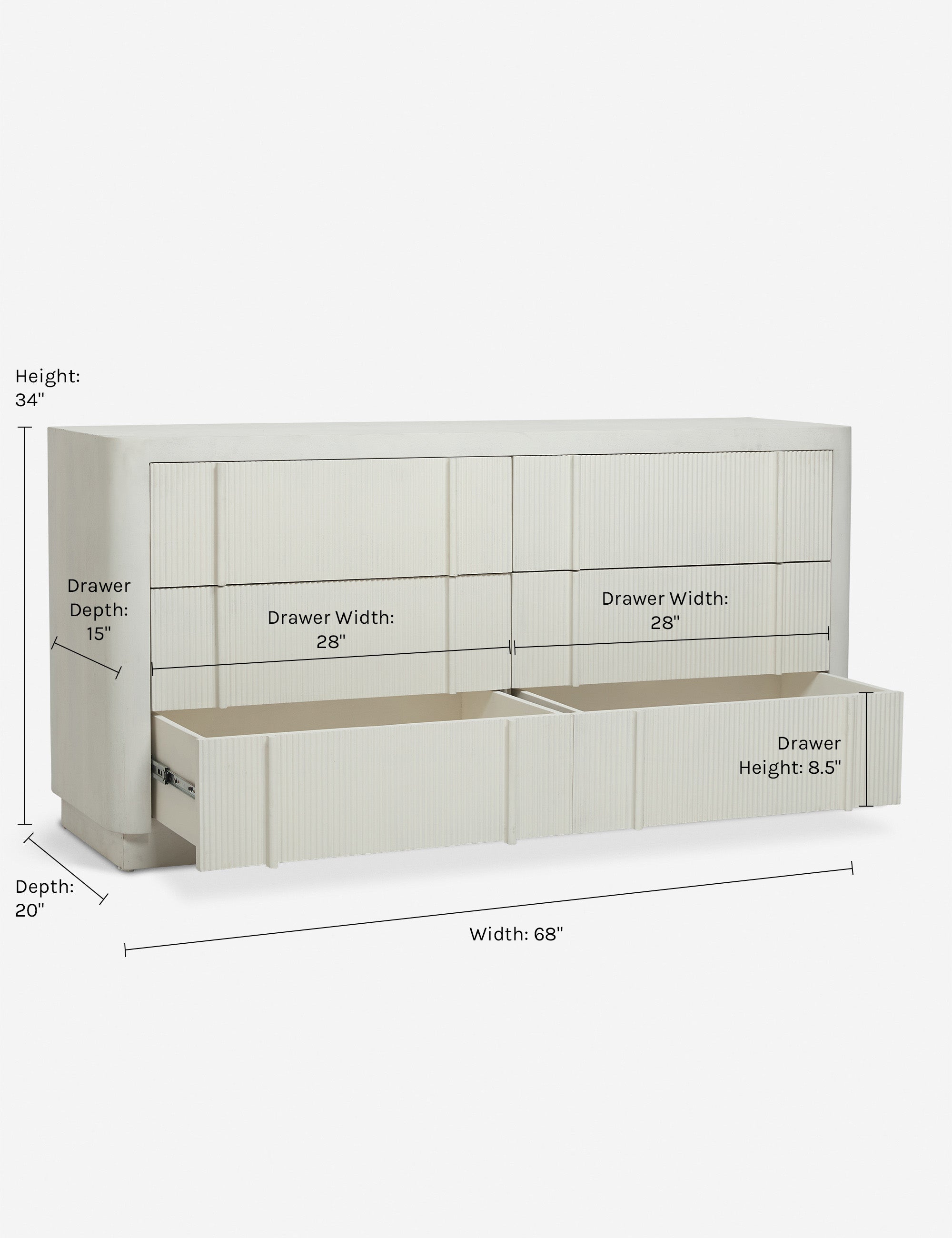 The Merrit dresser features a deco-inspired woodwork construction that pairs crisp, curving lines with ridged detailing and carved drawer pulls. Set on a plinth base, this dresser has six spacious drawers to add function and style to a transitional bedroom look. This piece is from our exclusive Sarah Sherman Samuel collaboration and features all the trademarks of her warm, edited style.