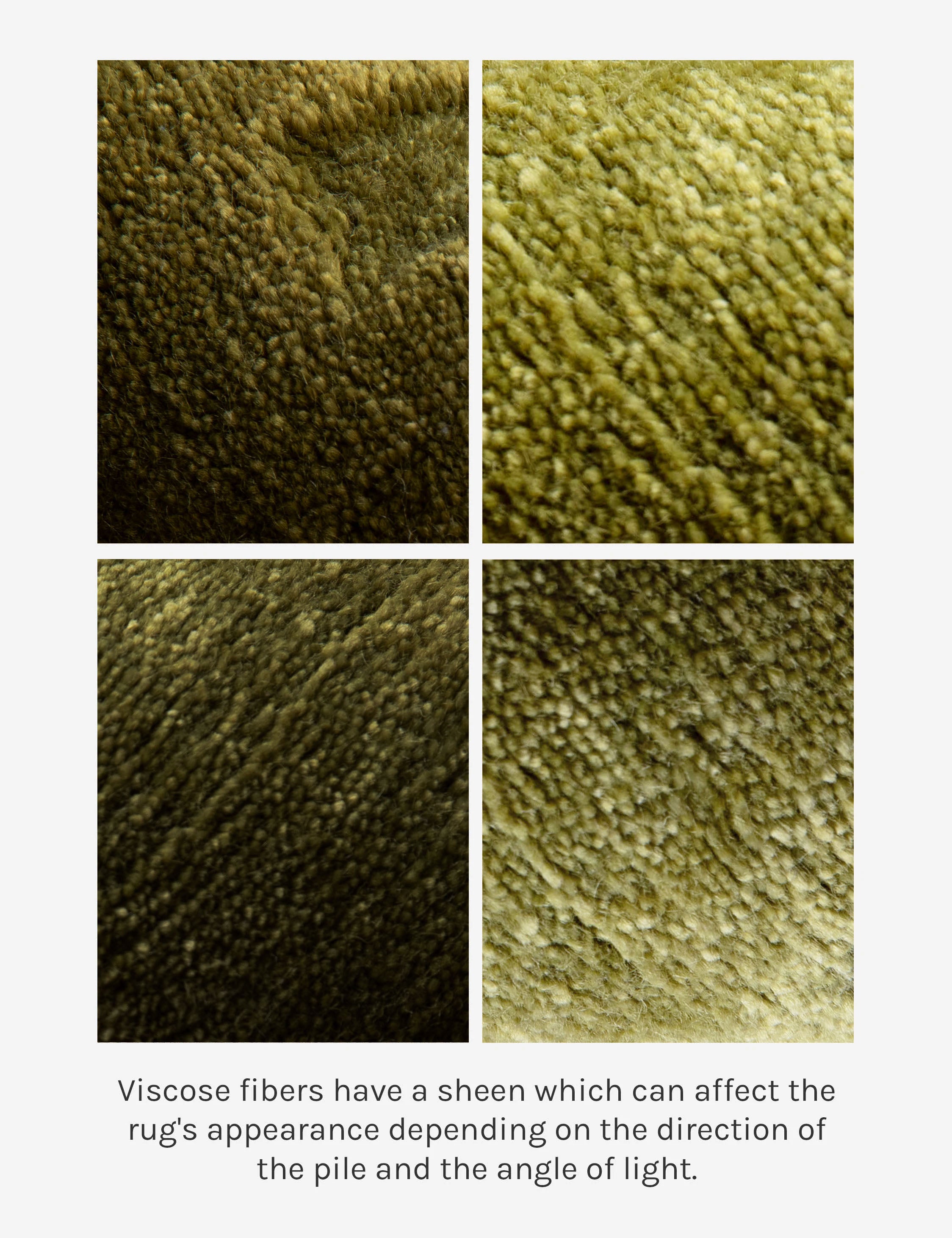 - material: Viscose is a luxurious material with a silky soft touch and a beautiful sheen. Viscose fibers have a sheen which can affect the rug's appearance depending on the direction of the pile and the angle of light. These delicate rugs work best in low-traffic areas like bedrooms and formal lounges away from pets, spills, and other wear and tear.