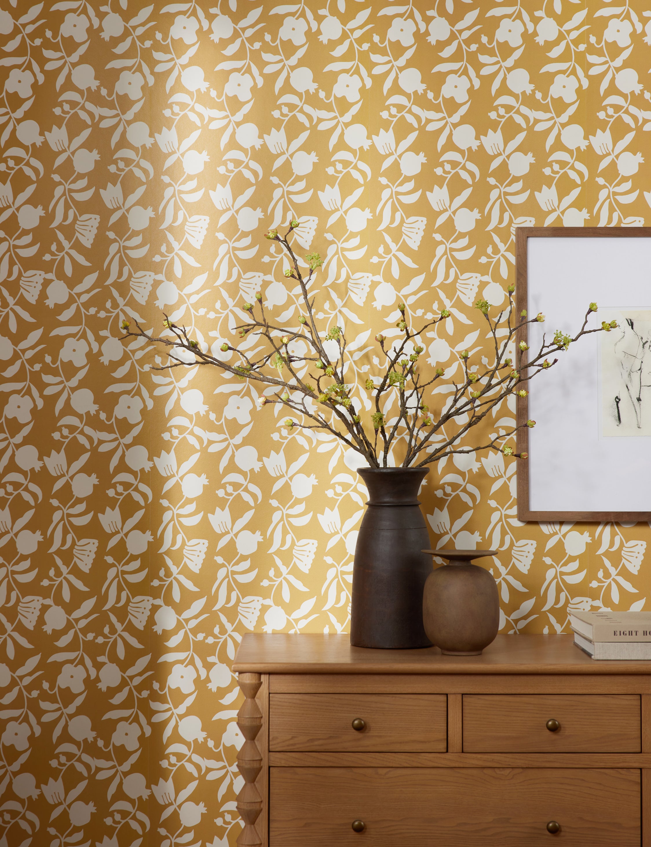 Pomegranate boughs provide a lush motif in this botanical wallpaper, filling the room with an ornate pattern. The bright tone and rich visual texture imbue any space with color and depth. This wallpaper is from our exclusive Sarah Sherman Samuel collaboration and features all the trademarks of her warm, edited style.