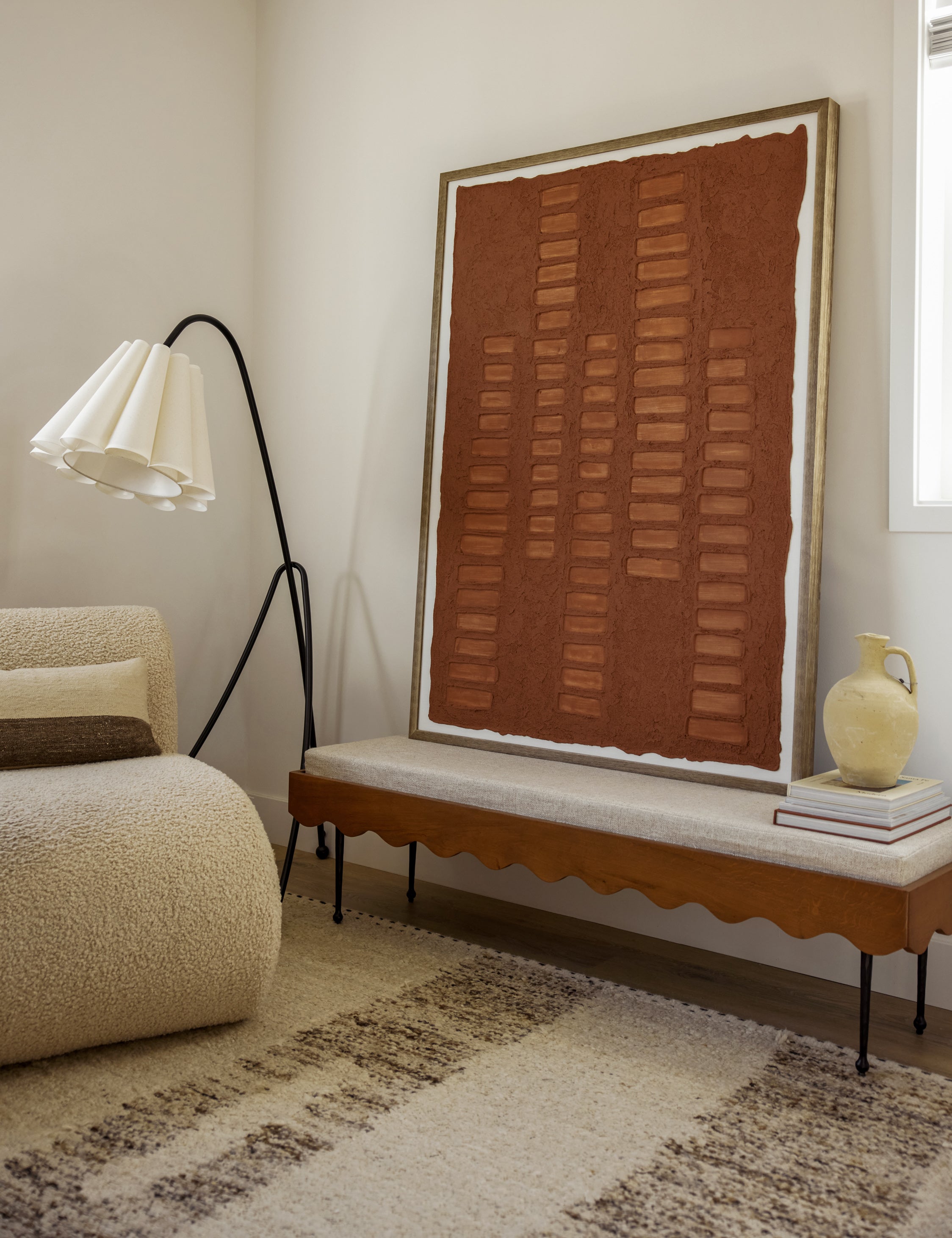 The Rise bench beautifully balances a mixed material construction with its rippled wood frame set on four spindle legs for an airy profile. At the perfect size for an entryway or the foot of your bed, this chic bench offers a practical accent with a signature edge. This piece is from our exclusive Sarah Sherman Samuel collaboration and features all the trademarks of her warm, edited style.