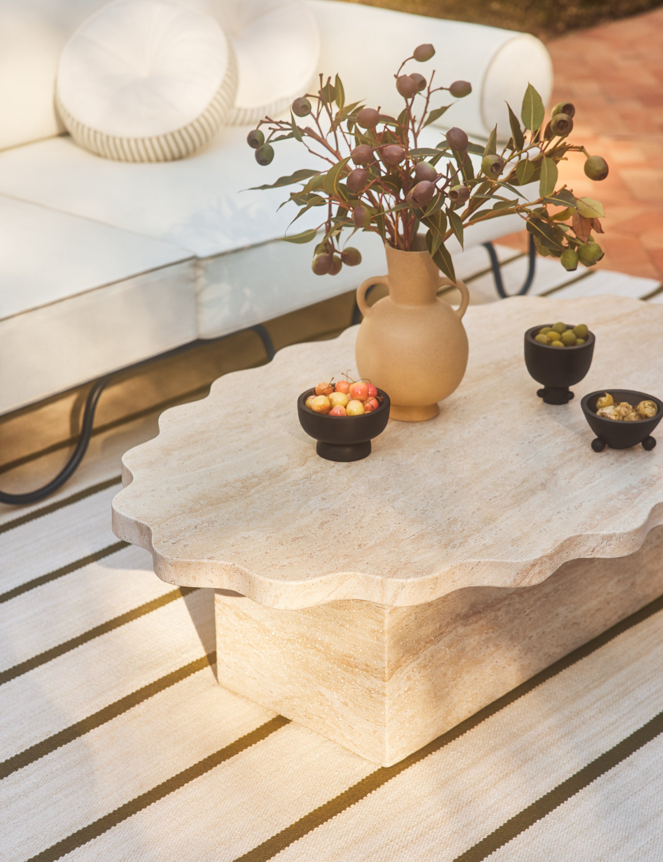 Bring shape to your edit with this scalloped coffee table. The table is crafted from fiber cement with a travertine-like finish for a sophisticated anchor piece indoors or out. This modern coffee table is from our exclusive Sarah Sherman Samuel collaboration and features all the trademarks of her warm, edited style.