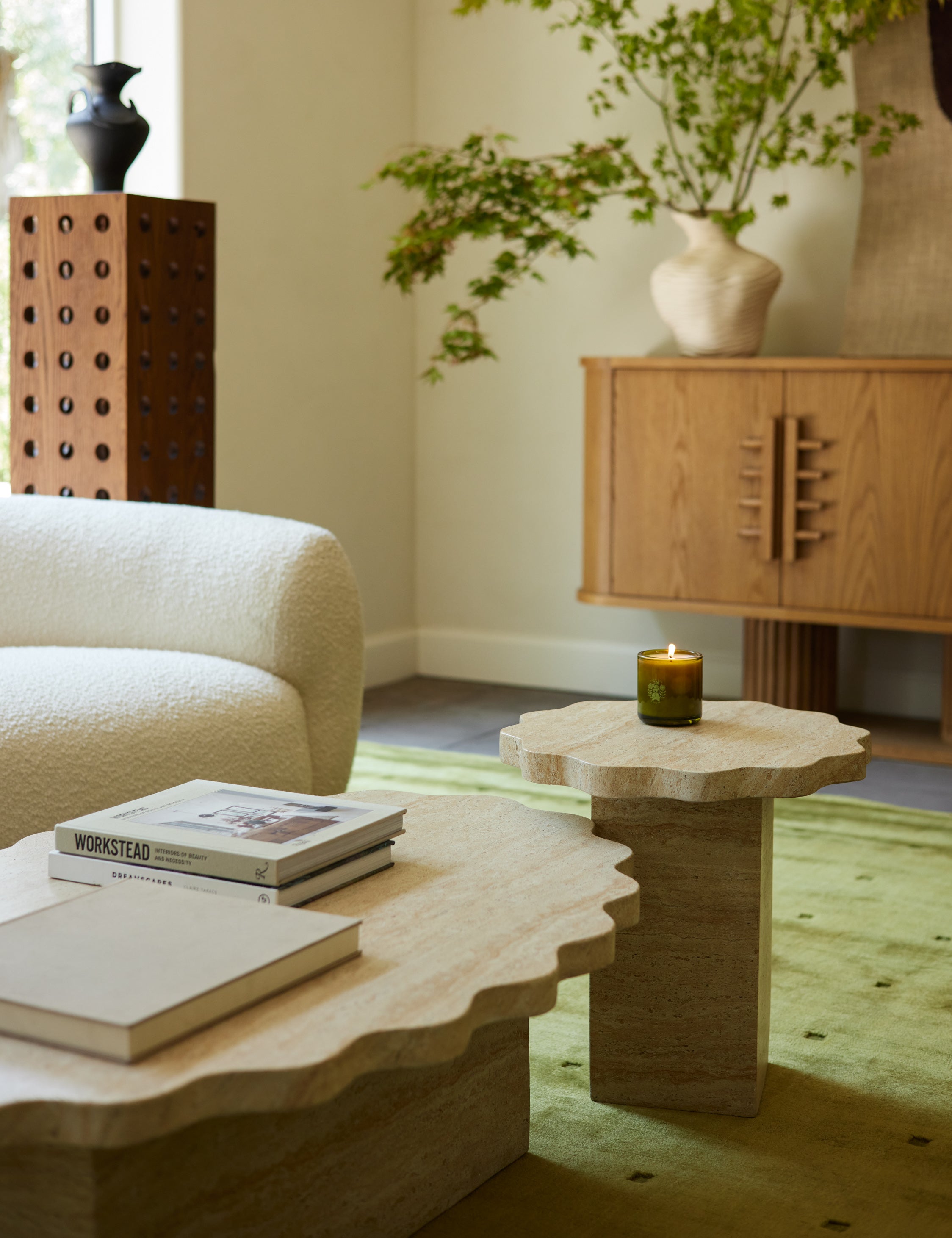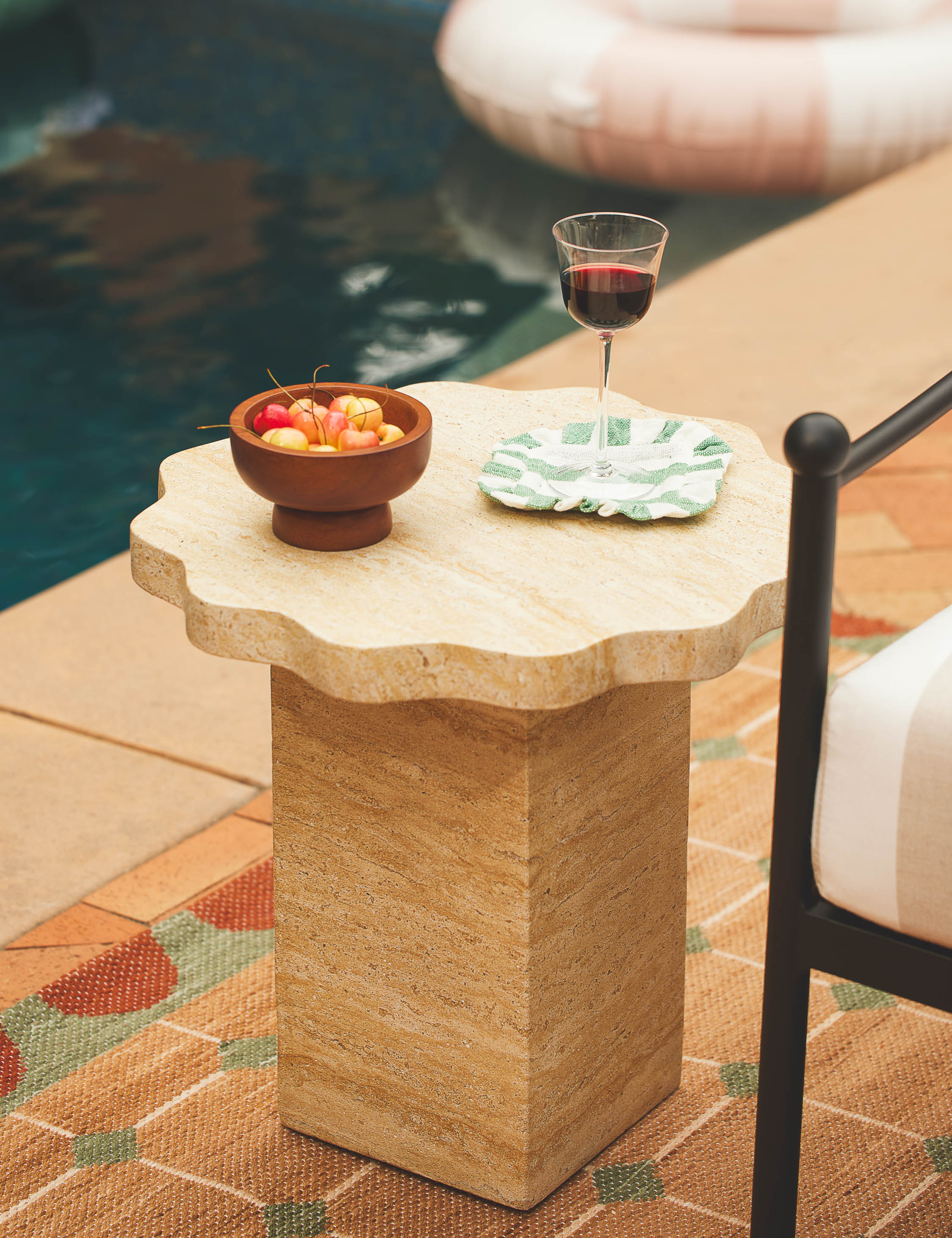 Bring shape to your edit with this scalloped side table. The table is crafted from fiber cement with a travertine-like finish for a sophisticated end table indoors or out. This accent piece is from our exclusive Sarah Sherman Samuel collaboration and features all the trademarks of her warm, edited style.
