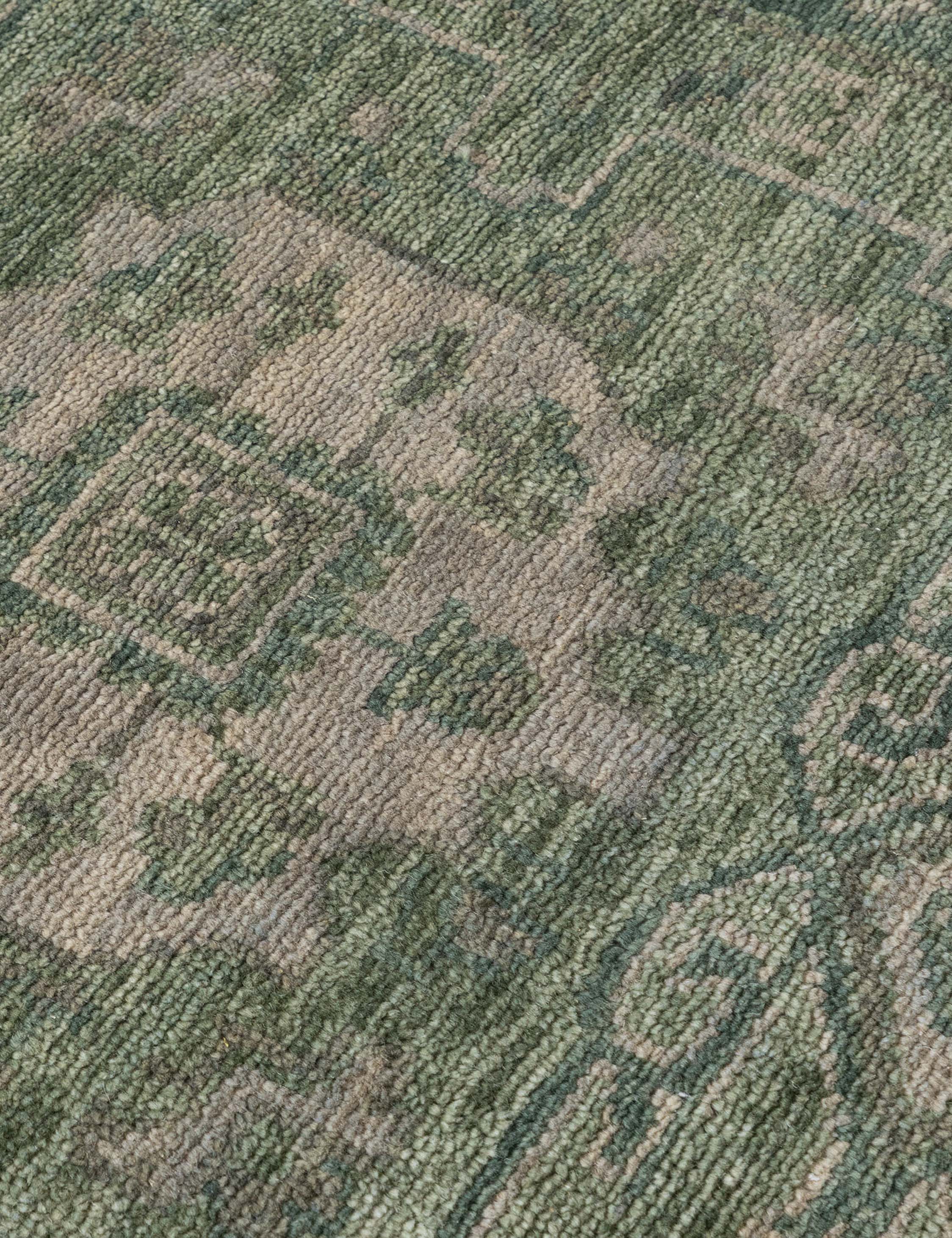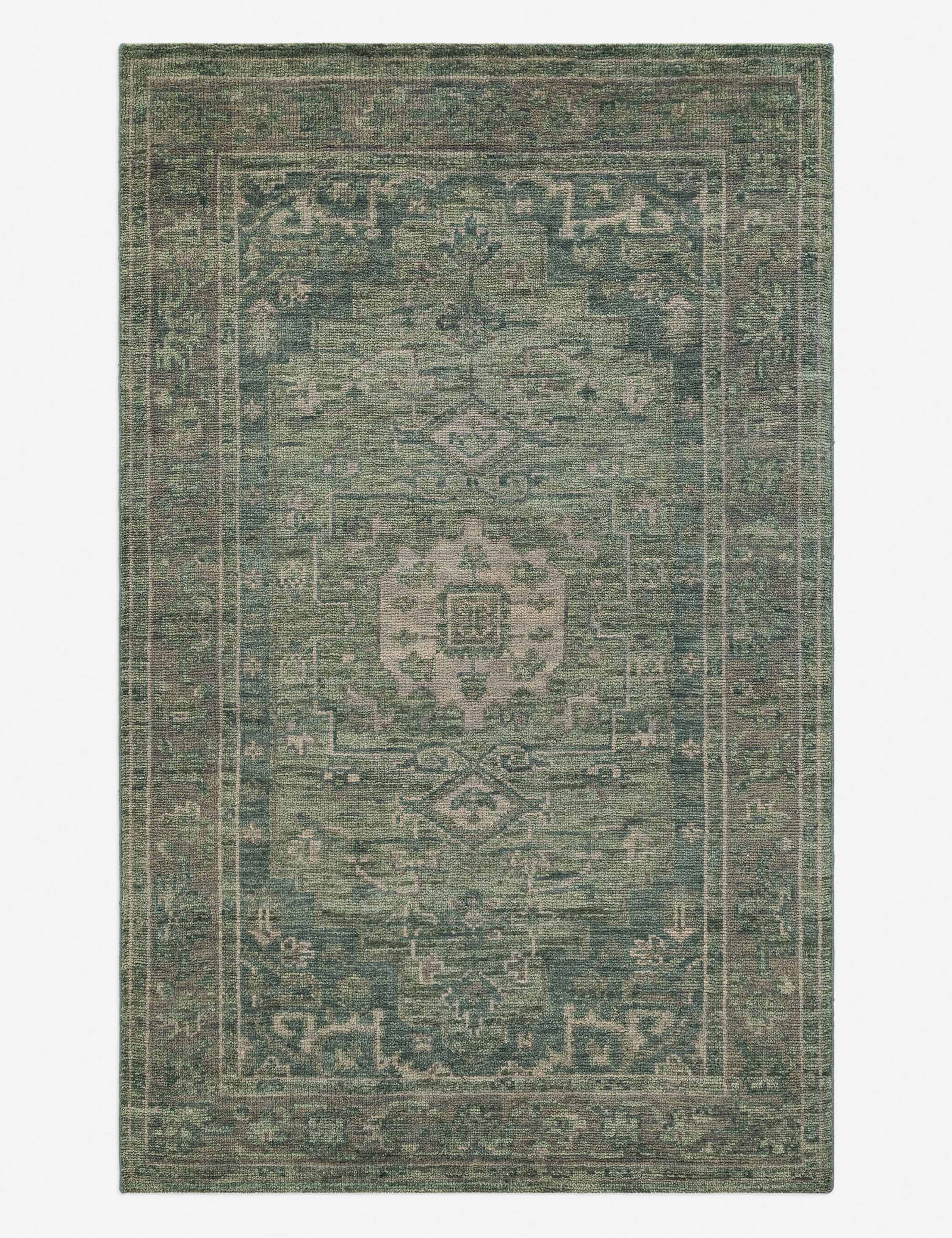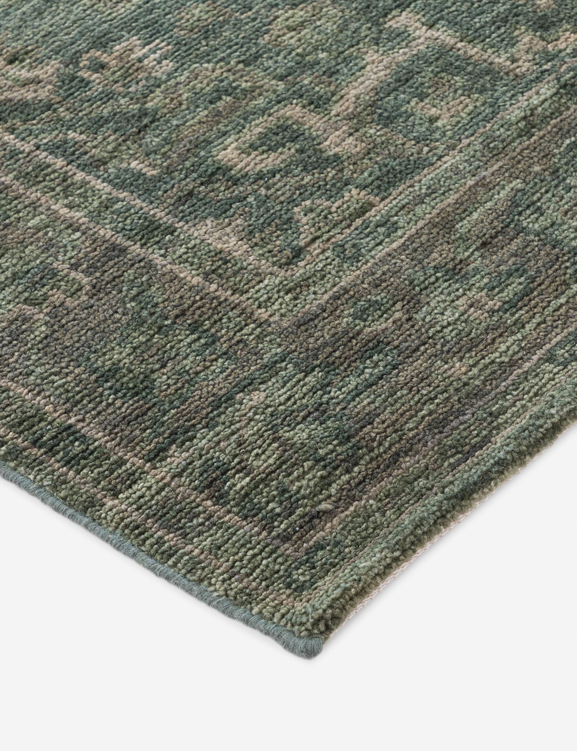 The Sovana rug revives classic motifs, hand-knotted in Sardinian wool with a verdant hue and vintage finish. Its refined patterning and heirloom quality offer timeless appeal, ready for a transitional design. Use this hand-knotted rug to add character and richness to a living room, library, or formal entryway.