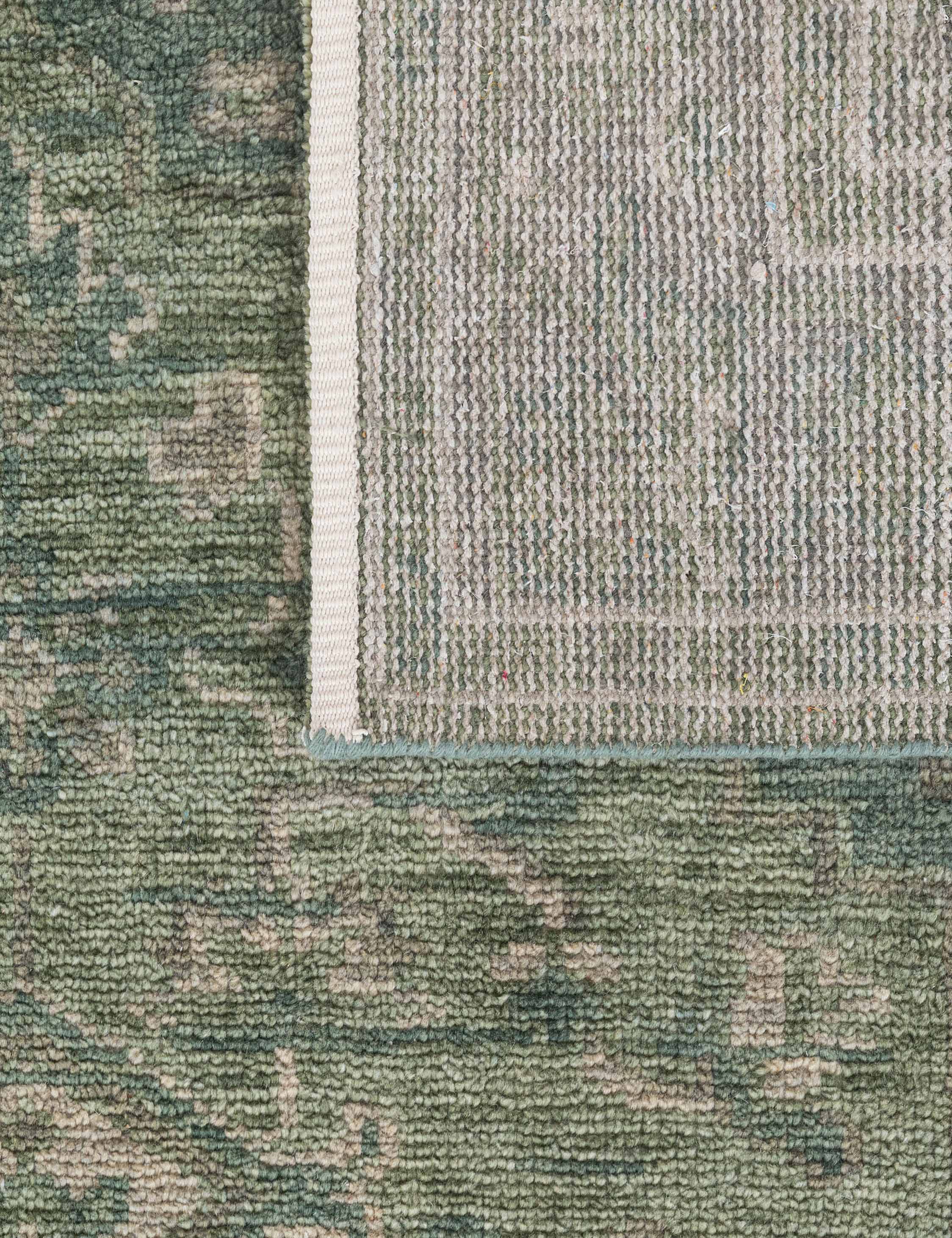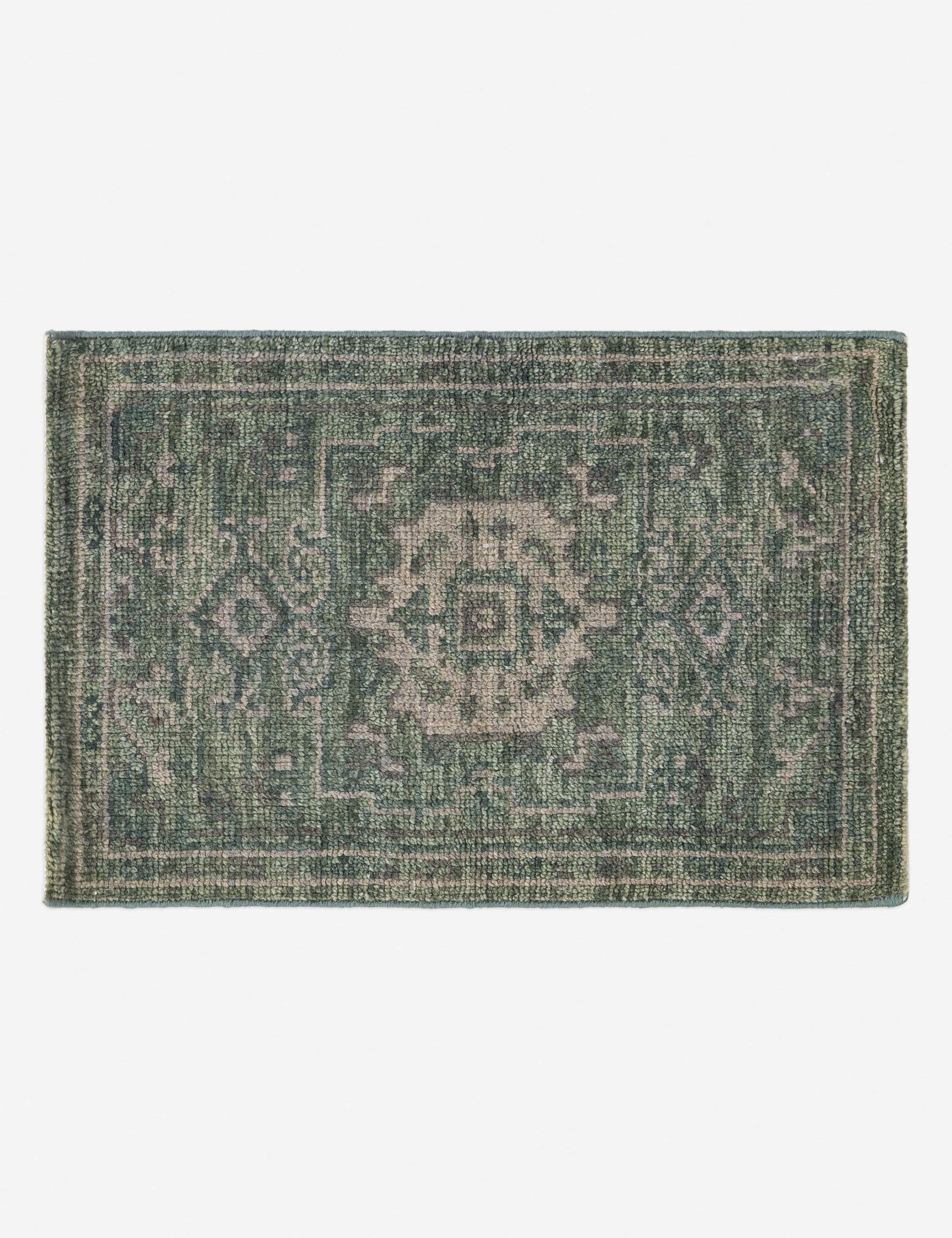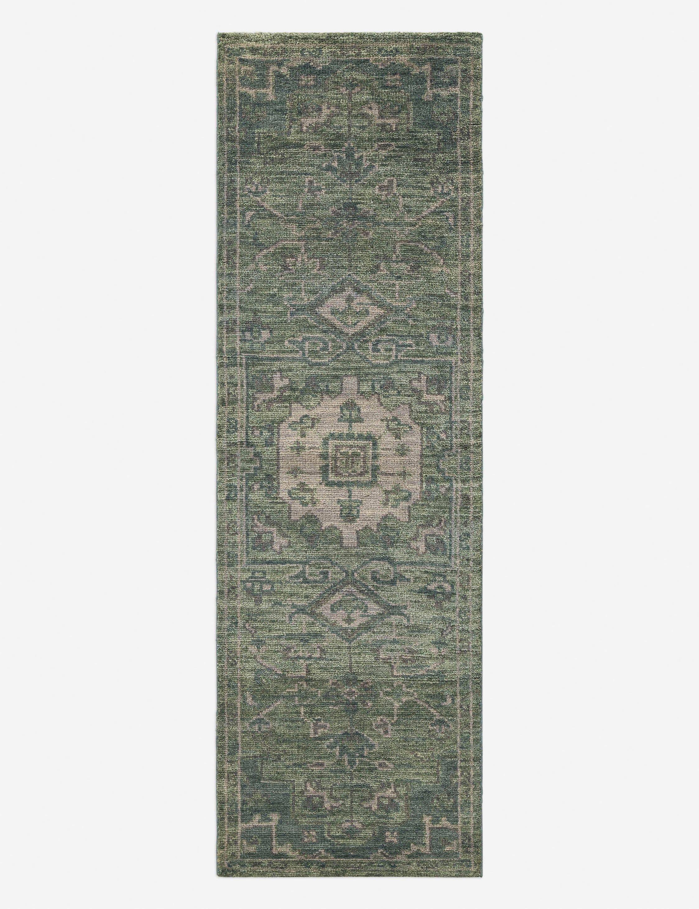The Sovana rug revives classic motifs, hand-knotted in Sardinian wool with a verdant hue and vintage finish. Its refined patterning and heirloom quality offer timeless appeal, ready for a transitional design. Use this hand-knotted rug to add character and richness to a living room, library, or formal entryway.
