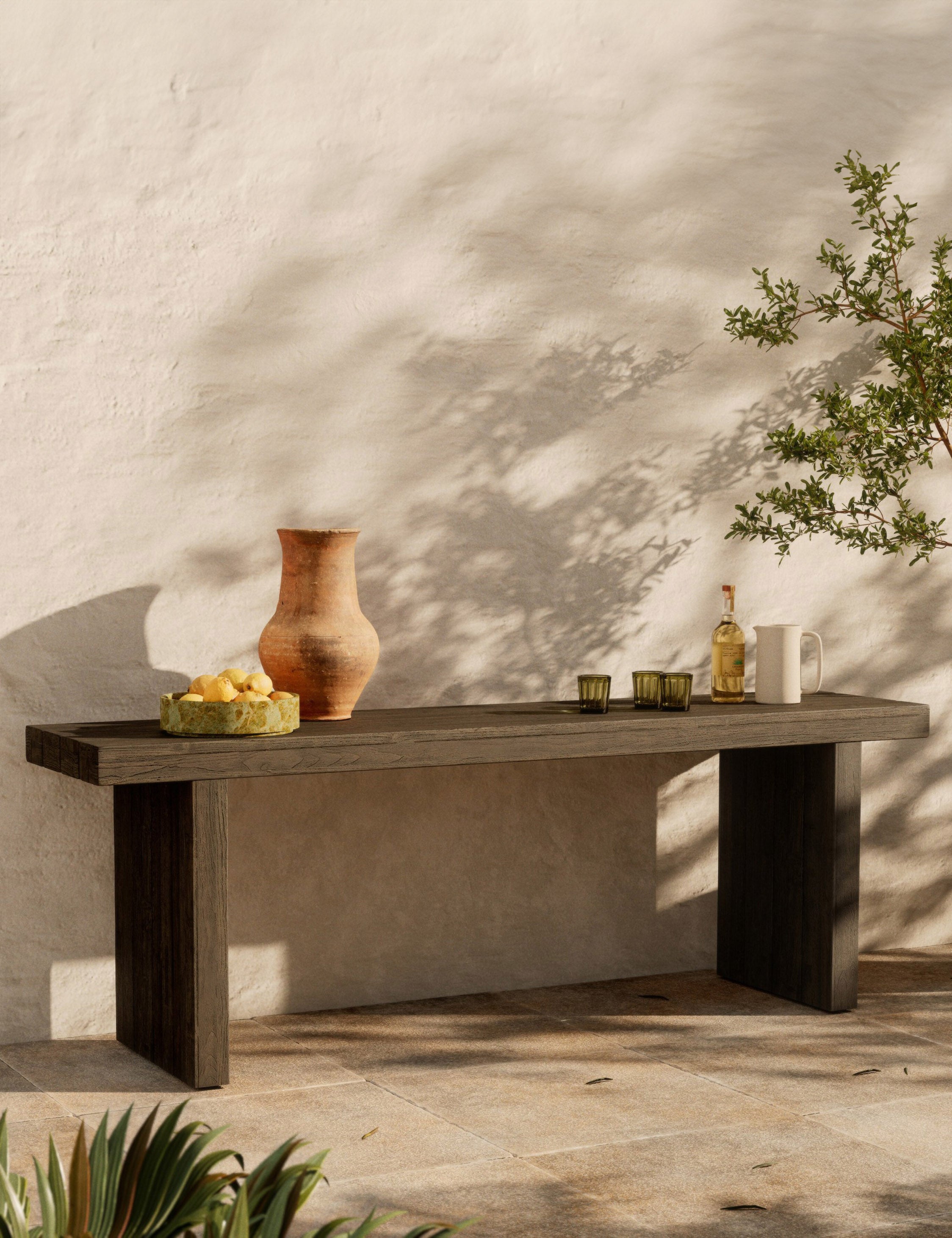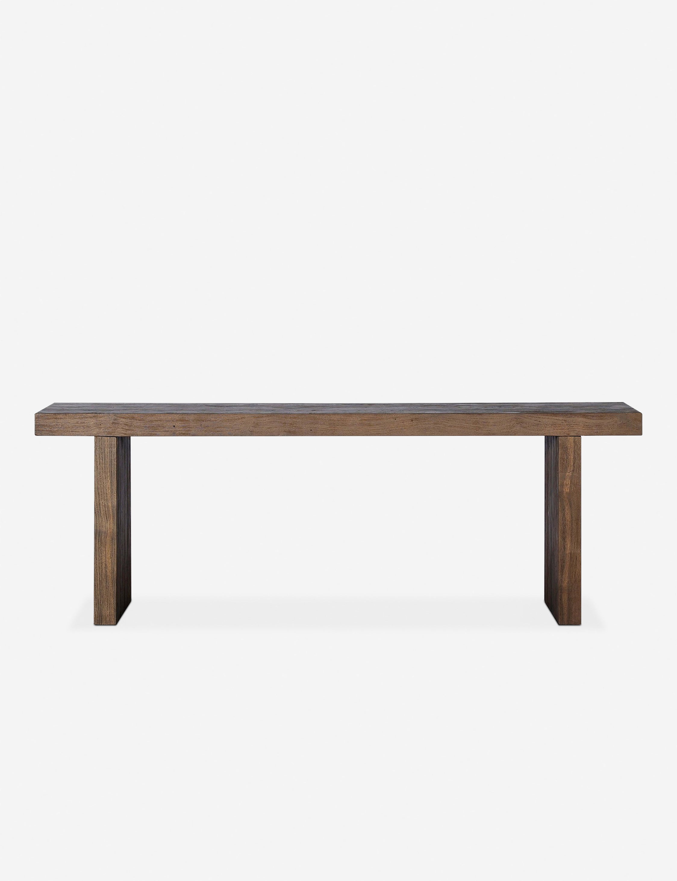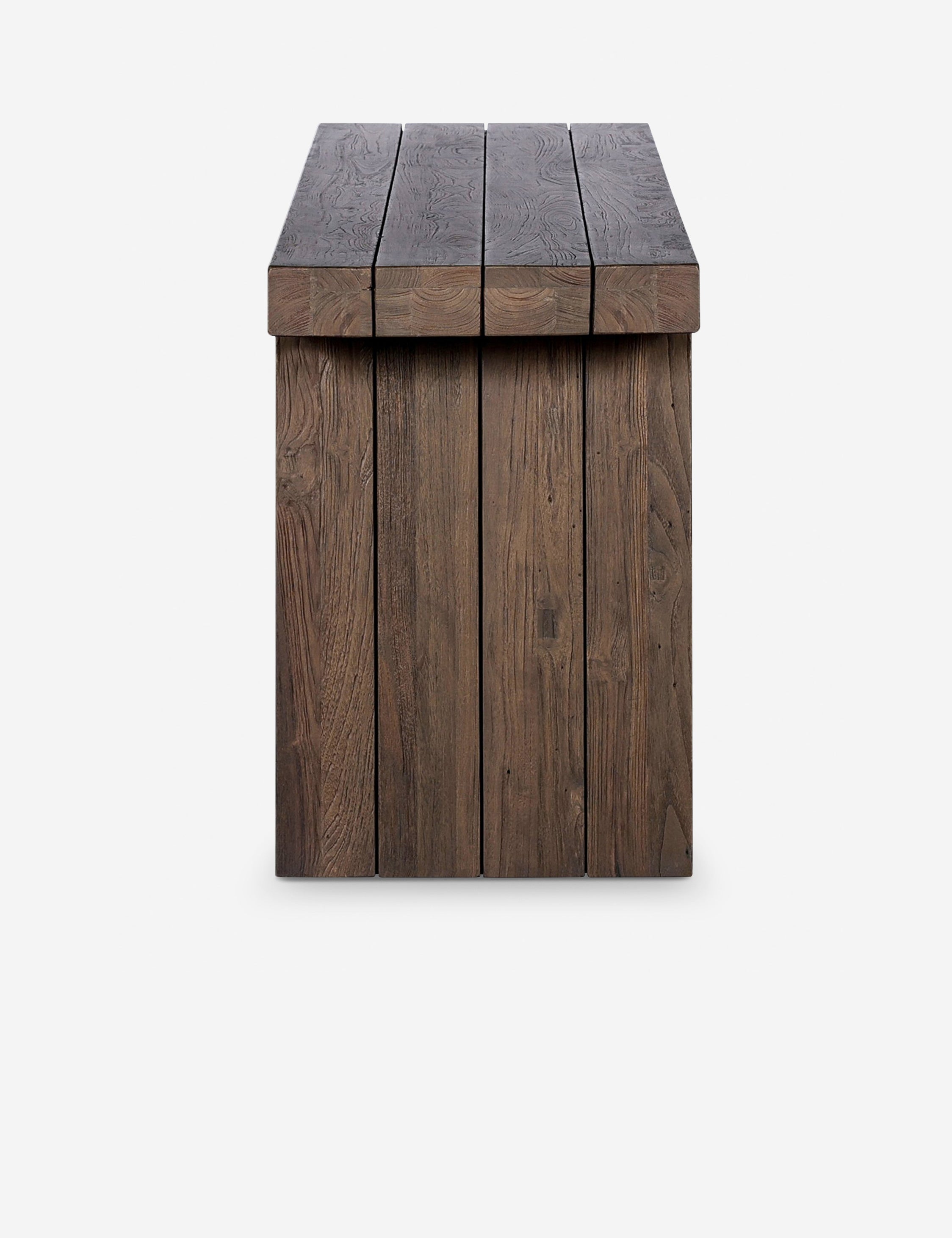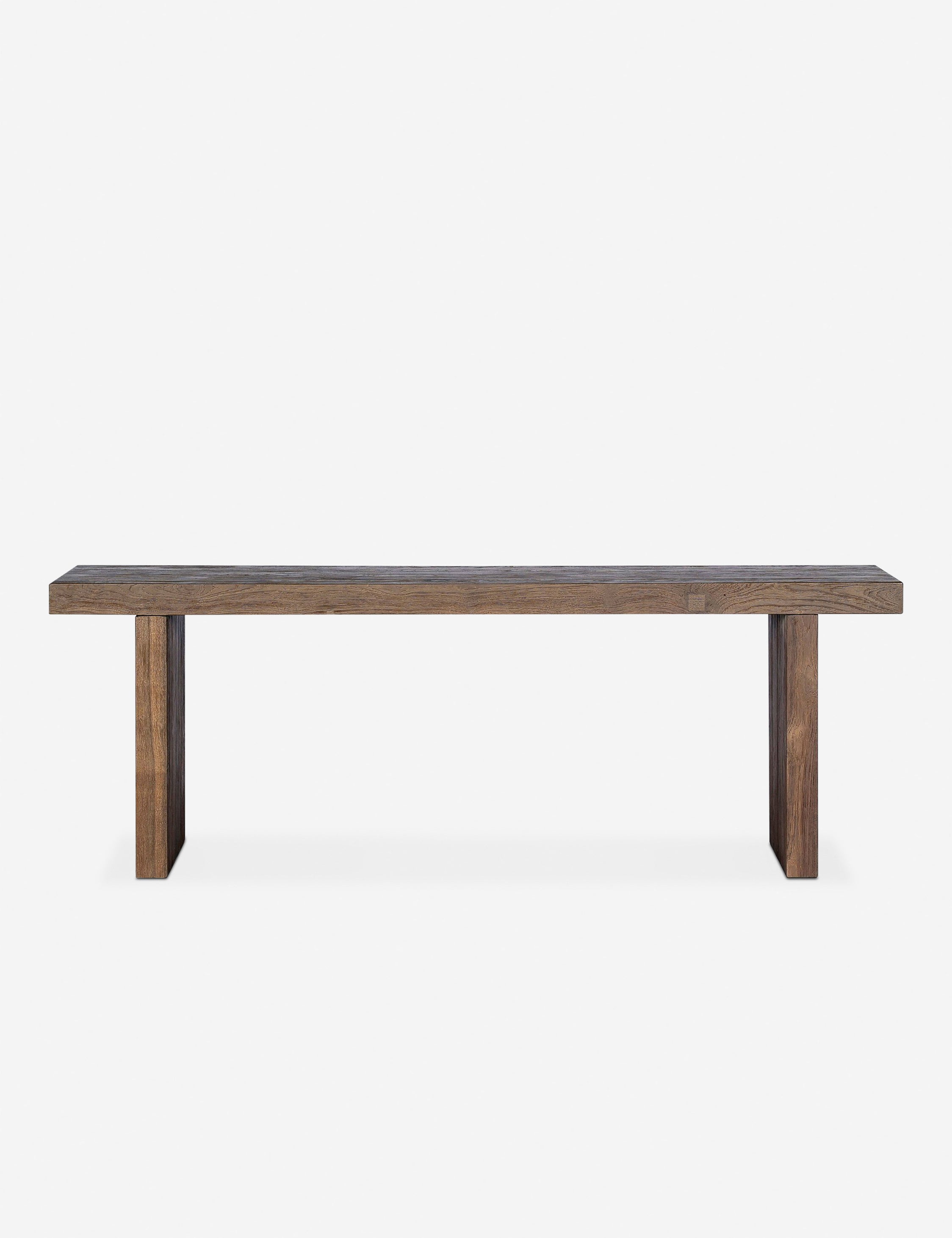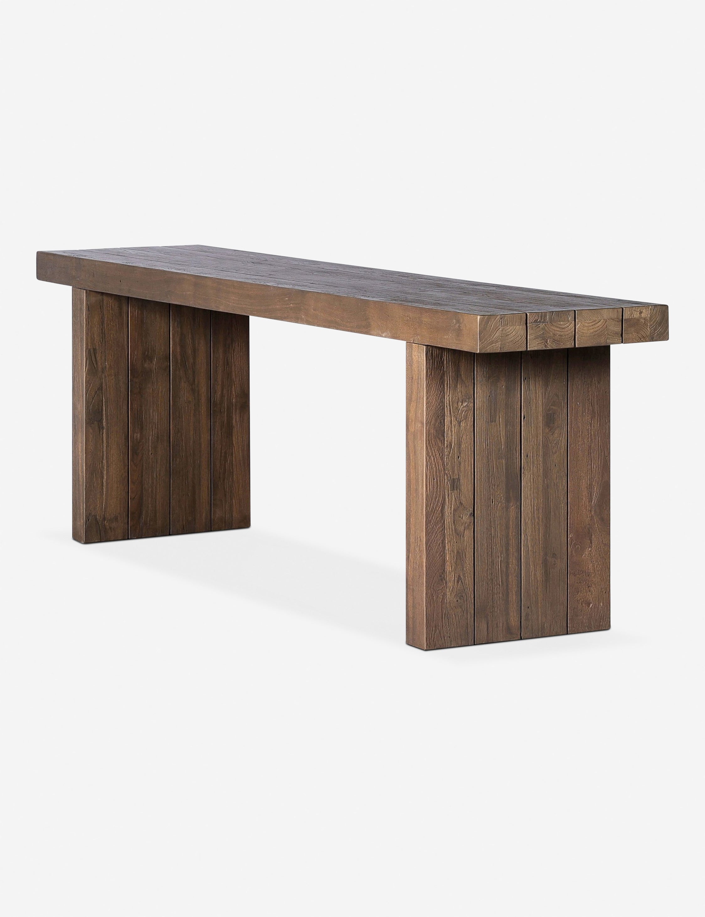 Thick cuts of reclaimed wood ground this console table with a simple, sturdy bearing. The original knots and grain of the wood are highlighted by a heritage brown stain that imbues warmth and elegance, whether styled as an entryway table or adding surface space to an outdoor area.