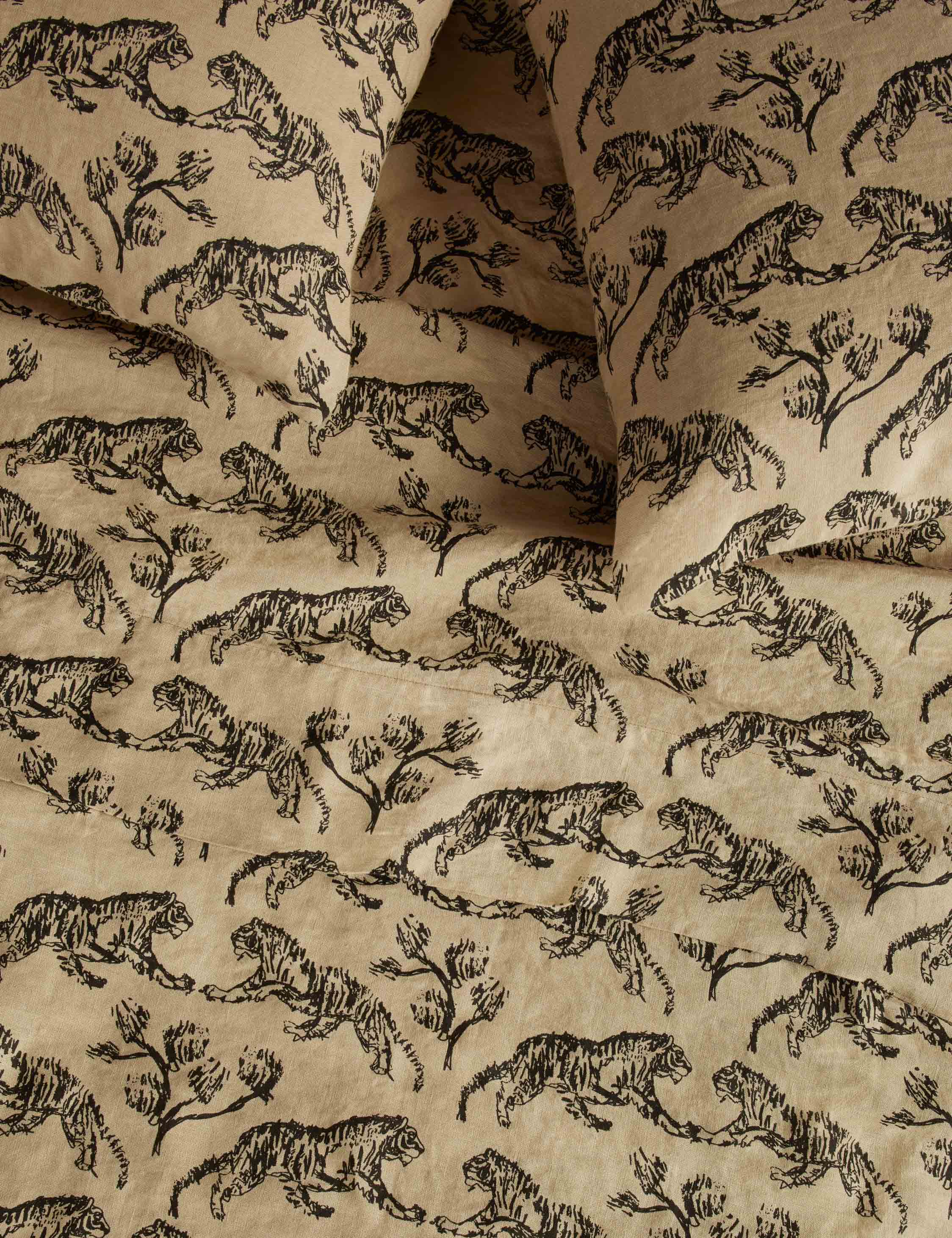 Vintage inspiration meets sustainable comfort in this hemp sheet set. Hemp is a forgotten fabric that is in revival because of its sustainable impact and durable fibers—meaning your bedding lasts longer. Drawn by Sarah's son and styled into an intricate motif, the tiger print offers graphic intrigue for a sophisticated feel. This set is from our exclusive Sarah Sherman Samuel collaboration and features all the trademarks of her warm, edited style.
