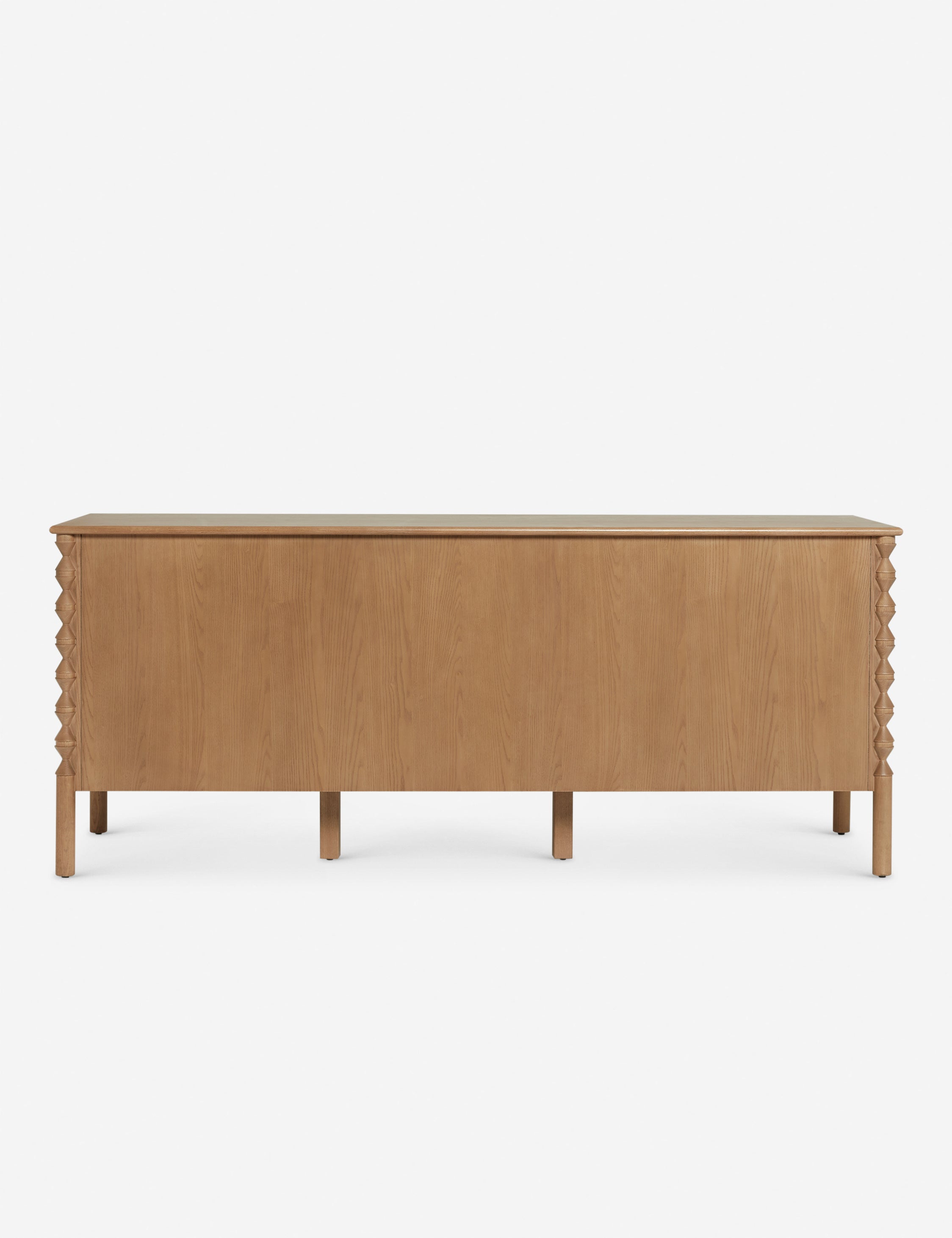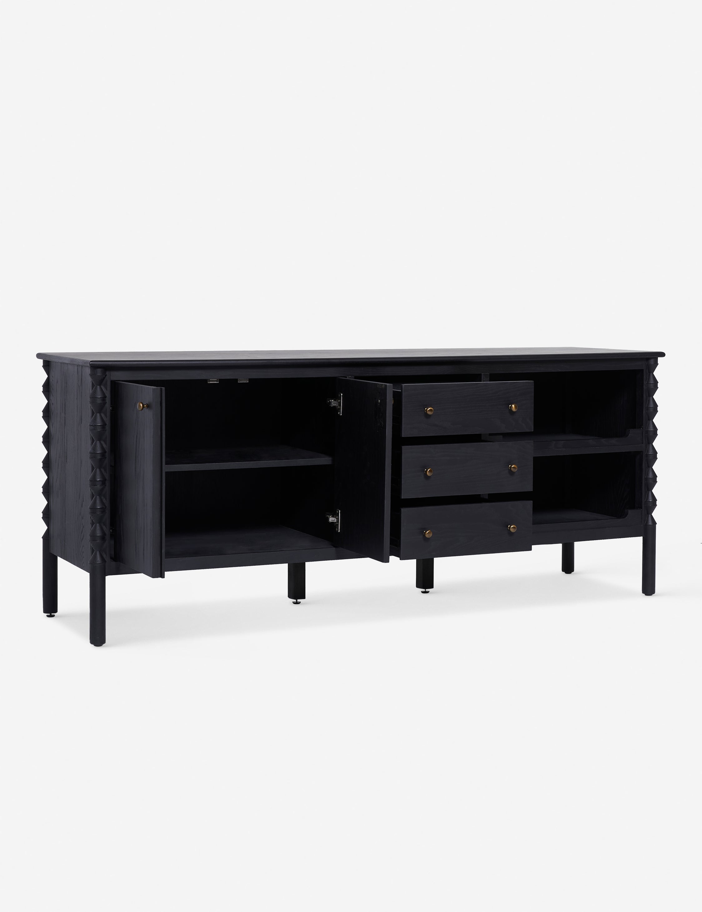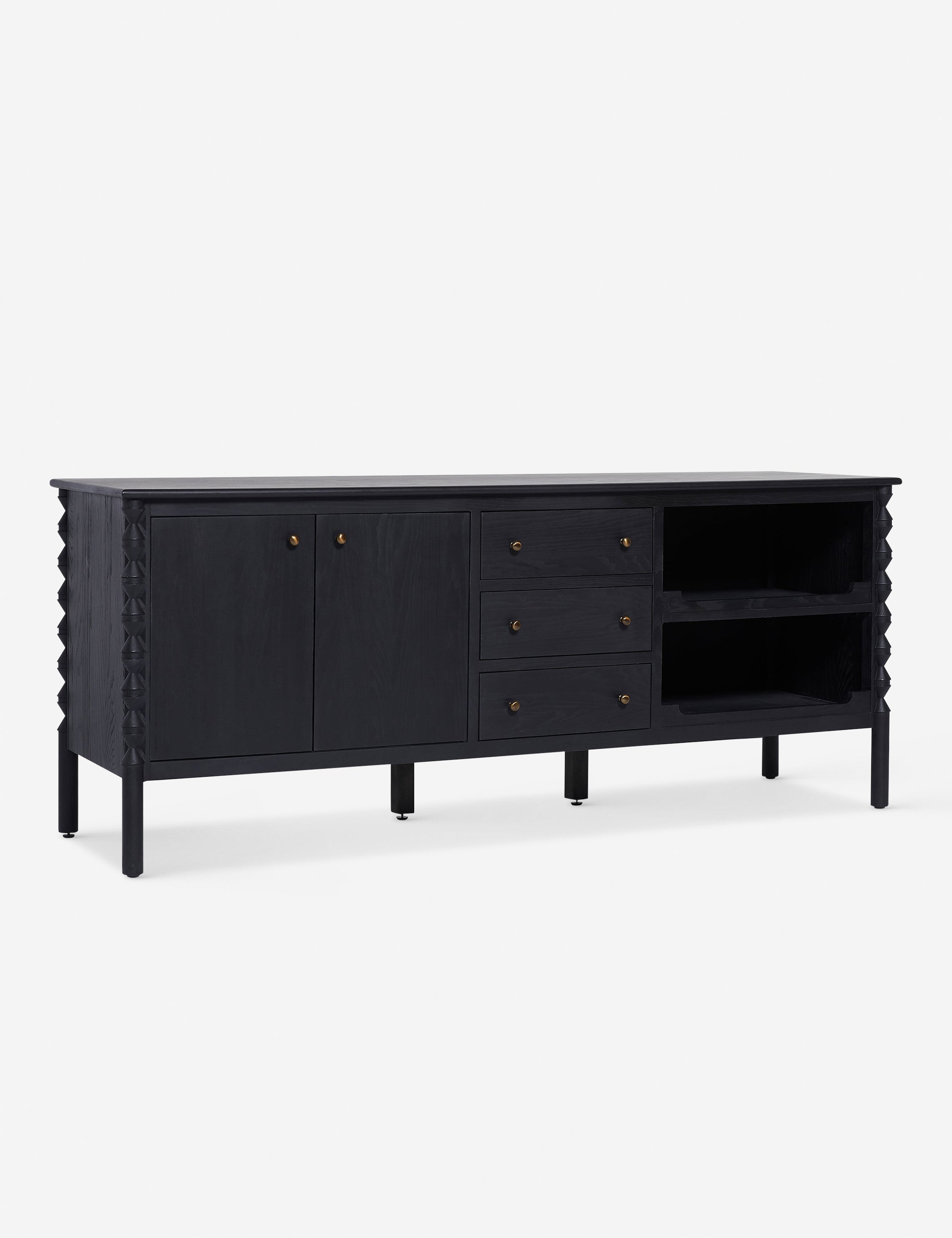 A traditional design offers ample storage in this sideboard from the exclusive Ginny Macdonald collection for Brightselects. Inspired by Ginny's English heritage and fondness for handcrafted details, each piece in the collection fuses traditional notes from her British roots with her California lifestyle. Turned legs add a touch of drama to the sideboard's classic silhouette featuring a mix of cabinets, drawers, and open shelving for practical everyday appeal.