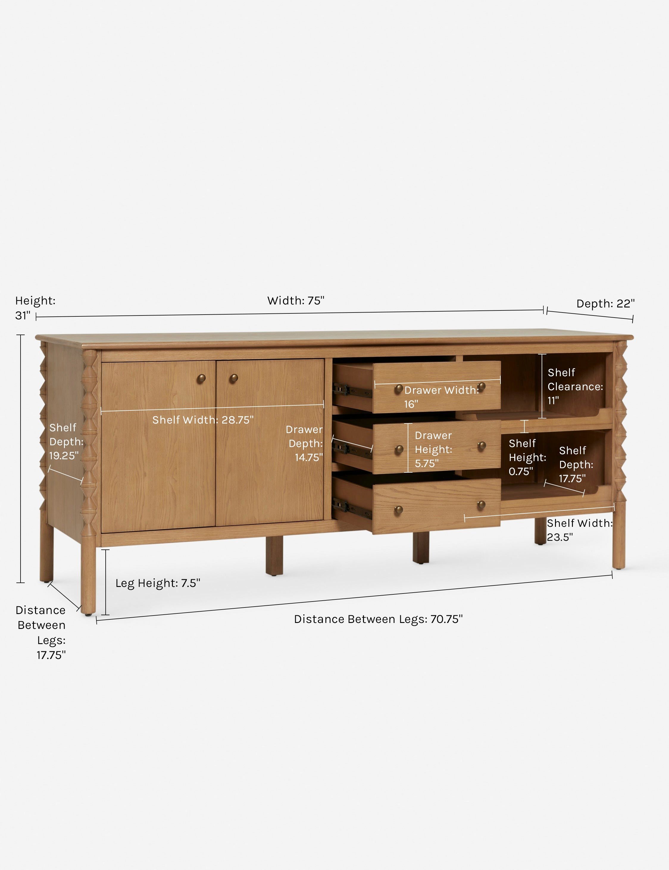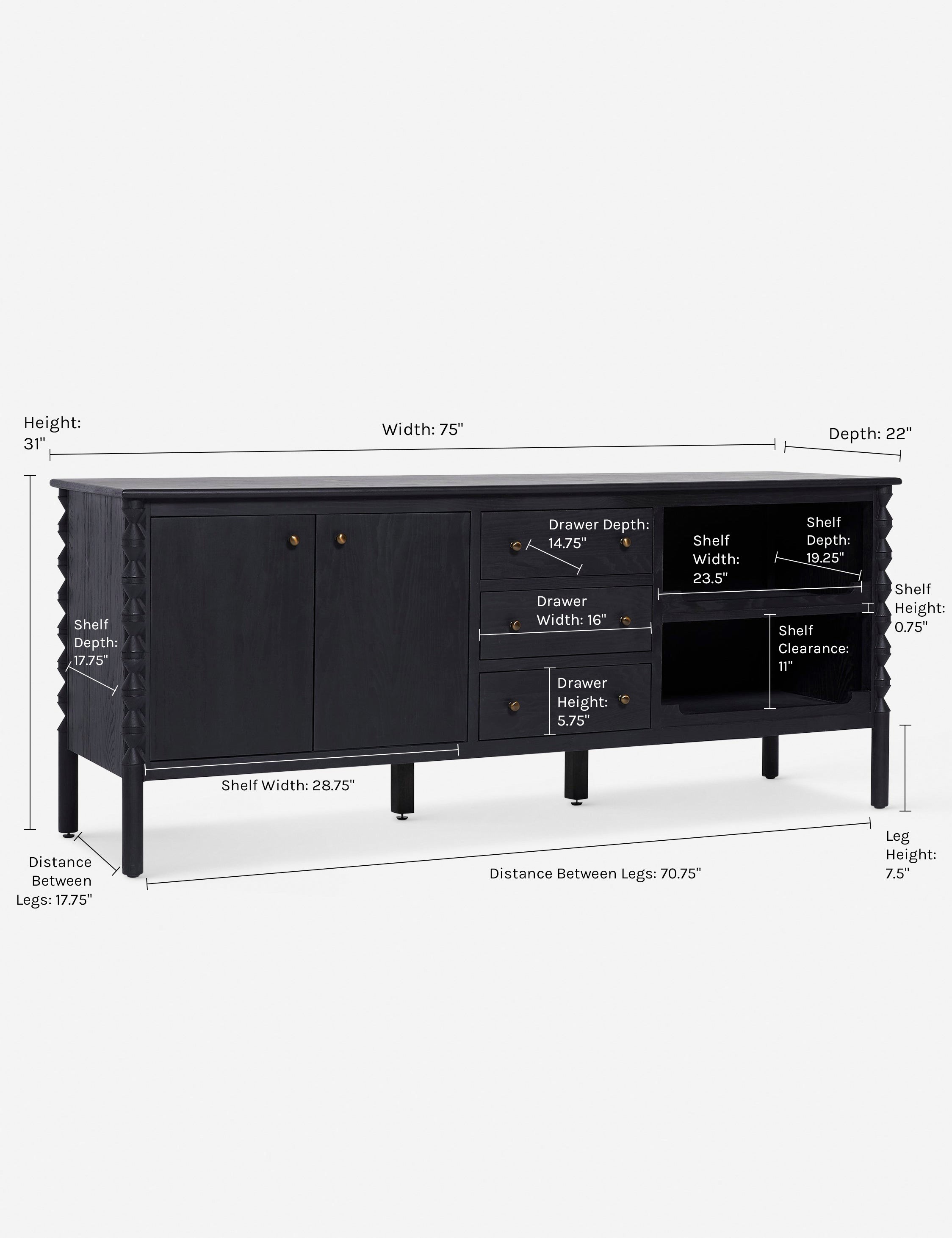 - Overall Dimensions: 75"W x 22"D x 31"H