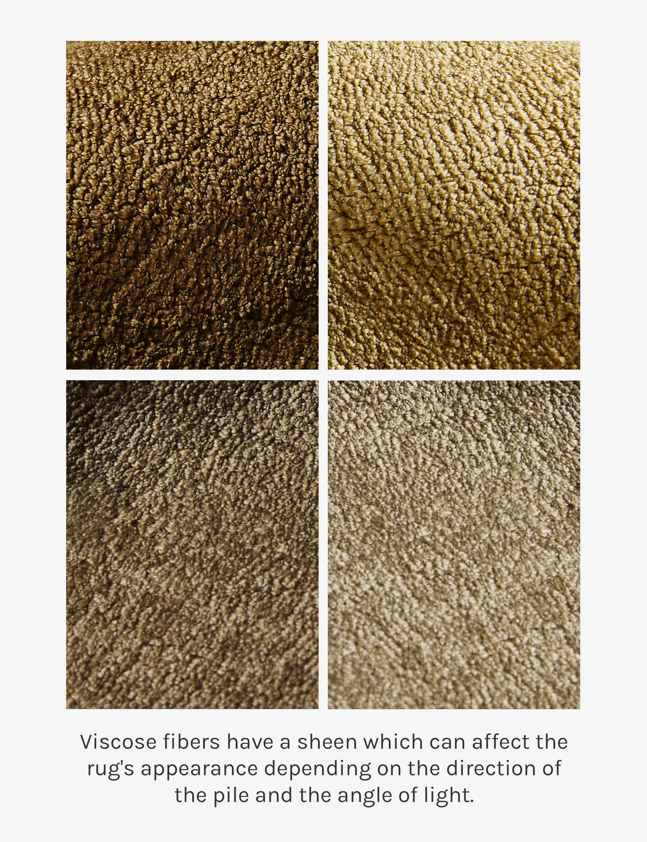 - material: Viscose is a luxurious material with a silky soft touch and a beautiful sheen. Viscose fibers have a sheen which can affect the rug's appearance depending on the direction of the pile and the angle of light. These delicate rugs work best in low-traffic areas like bedrooms and formal lounges away from pets, spills, and other wear and tear.