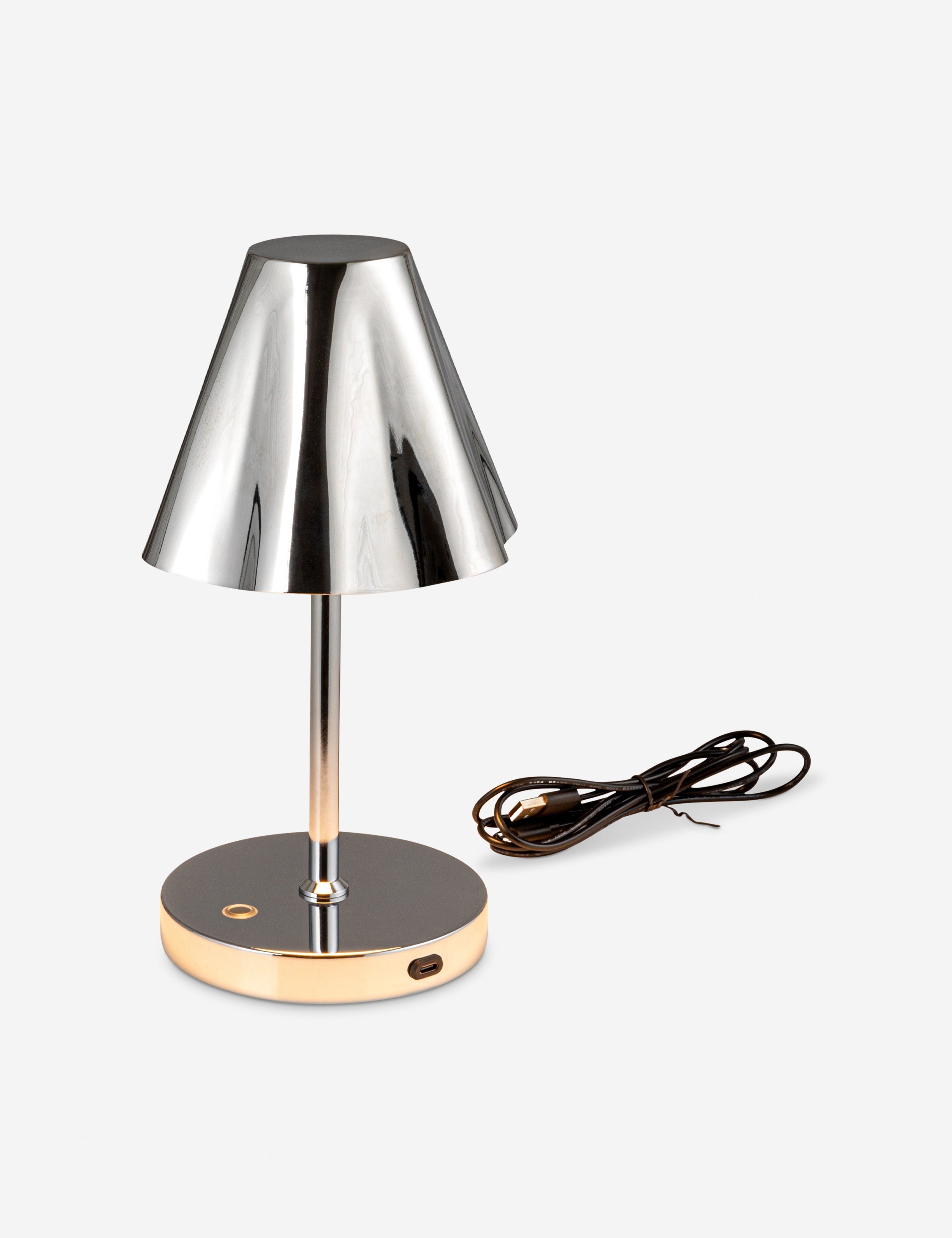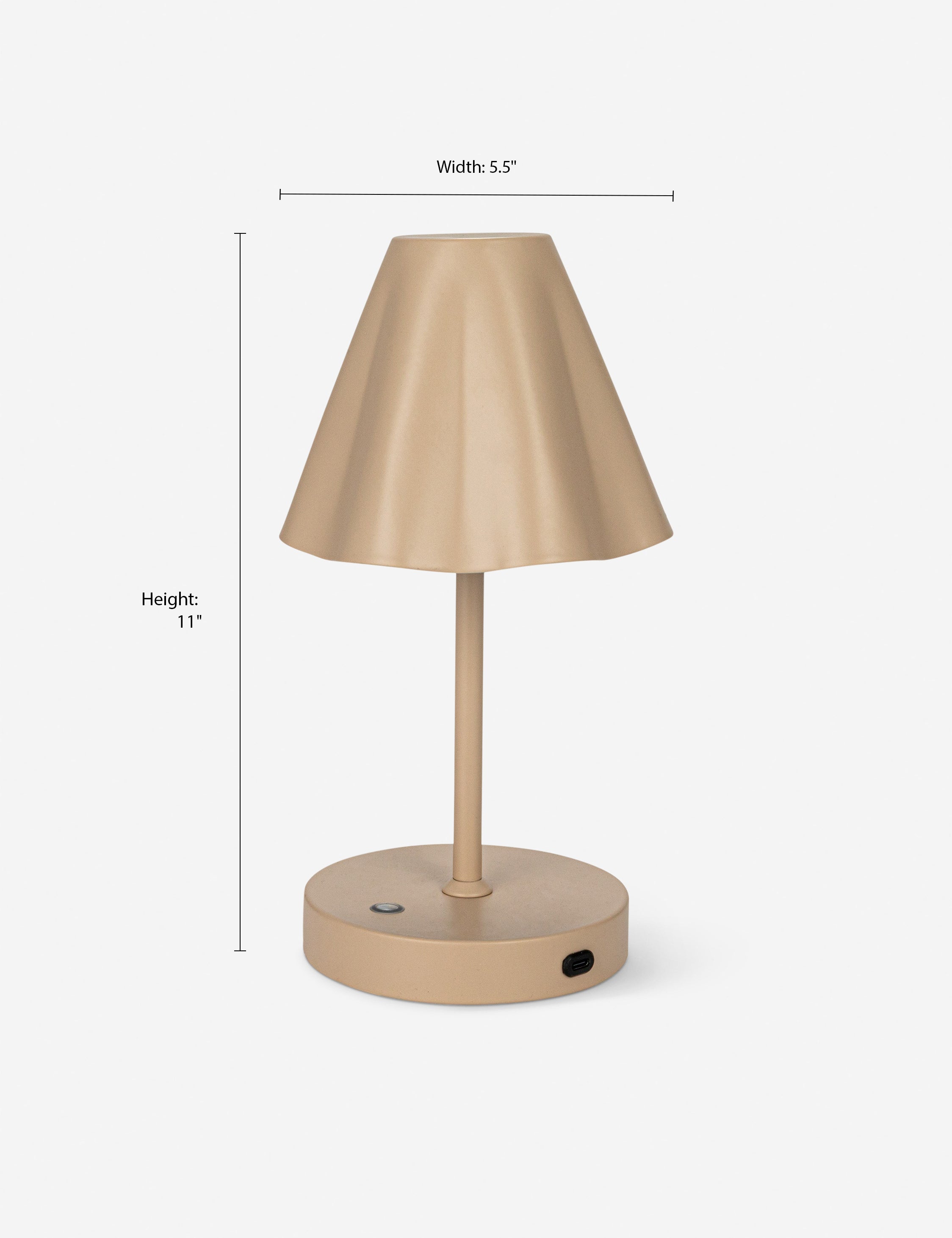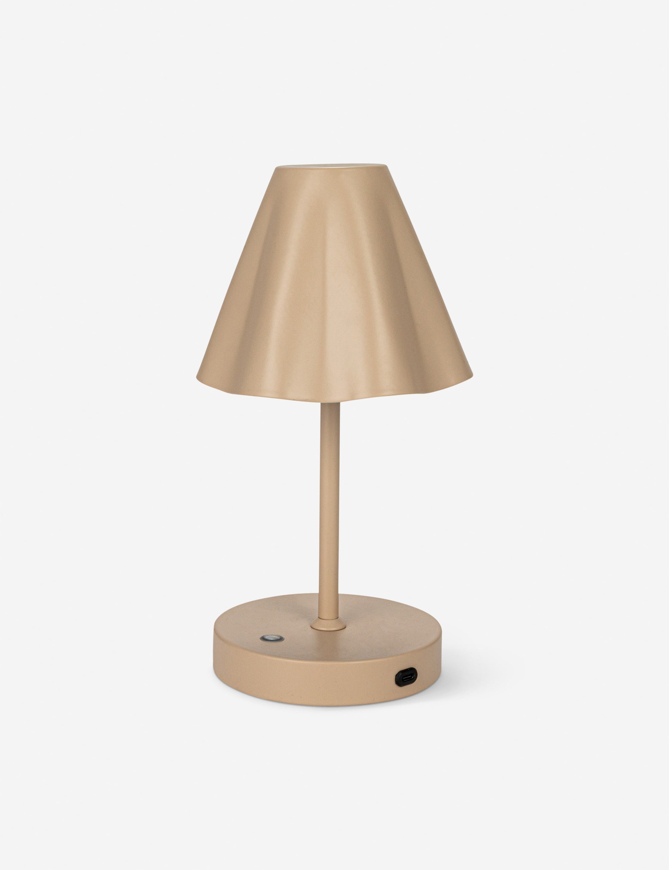 The Wickham lamp brings a touch of whimsy to tabletop light. A monochromatic finish highlights the slender silhouette, featuring a wavy metal shade and round base with a touch sensor for easy on/off functionality. The rechargeable design provides 9 hours of light so you can place these small lamps almost anywhere without worry of cords.